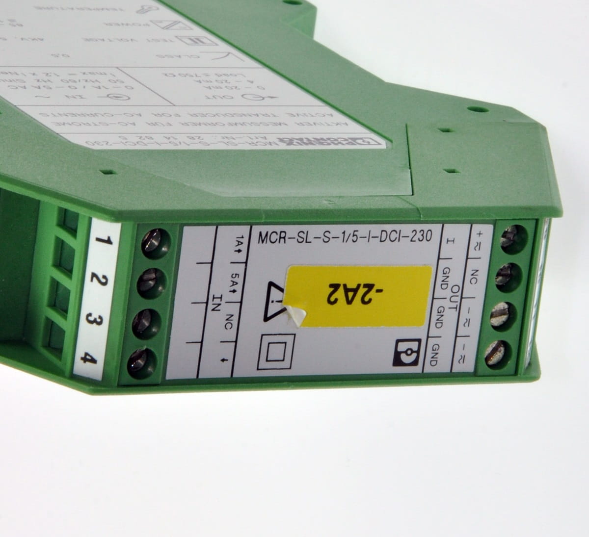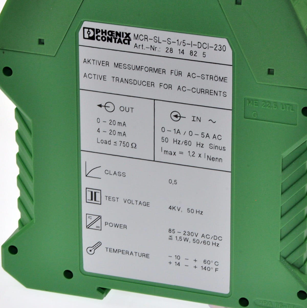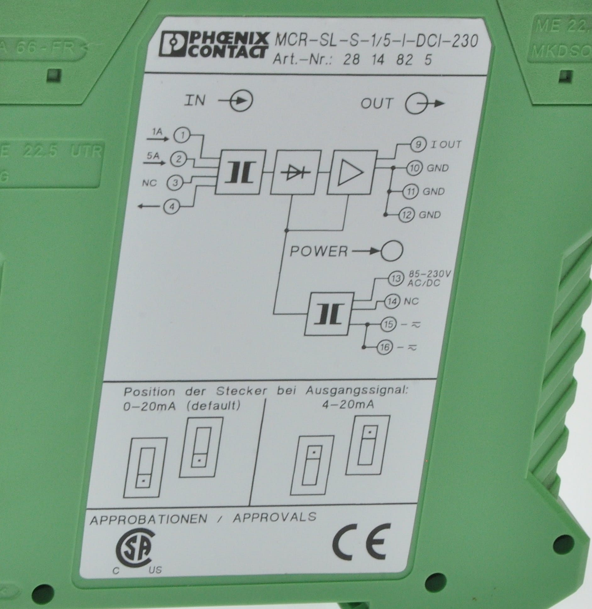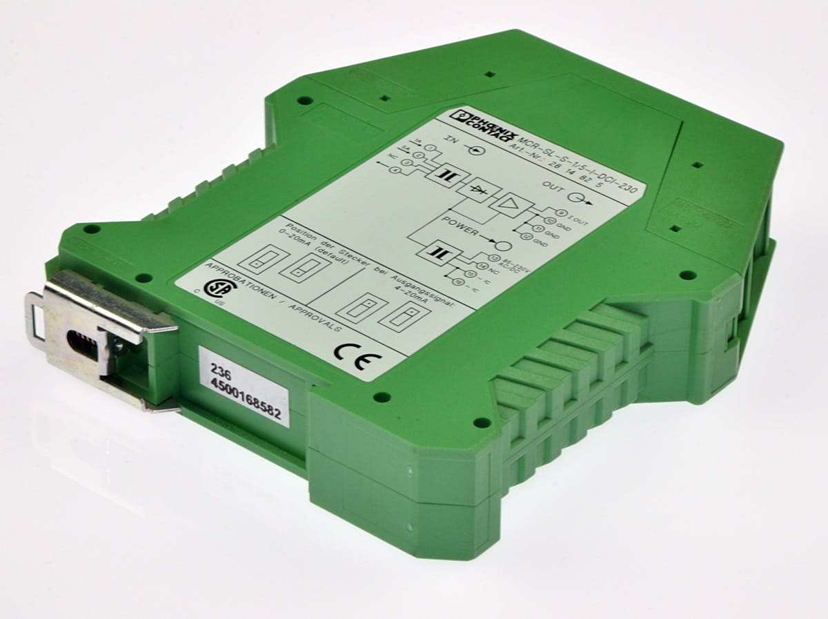 Używany, całkowicie sprawny element o symbolu: MCR-SL-S-1/5-I-DCI-230, produkt firmy Phoenix Contact. Art. Nr. 28 14 82 5. Jest to przetwornik pomiarowy prądu przemiennego o zakresie od 0 do 5A. Wyjście proporcjonalne 0-20mA lub 4-20mA. Posiada dwa zakresy pomiarowe: 0-1A i 0-5A. Zasilanie samego modułu napięciem przemiennym w zakresie od 85 do 230V.