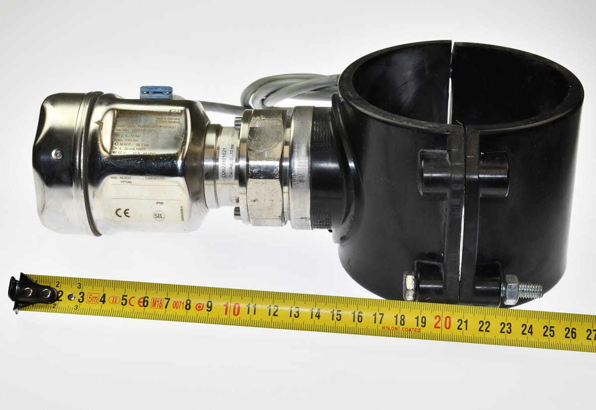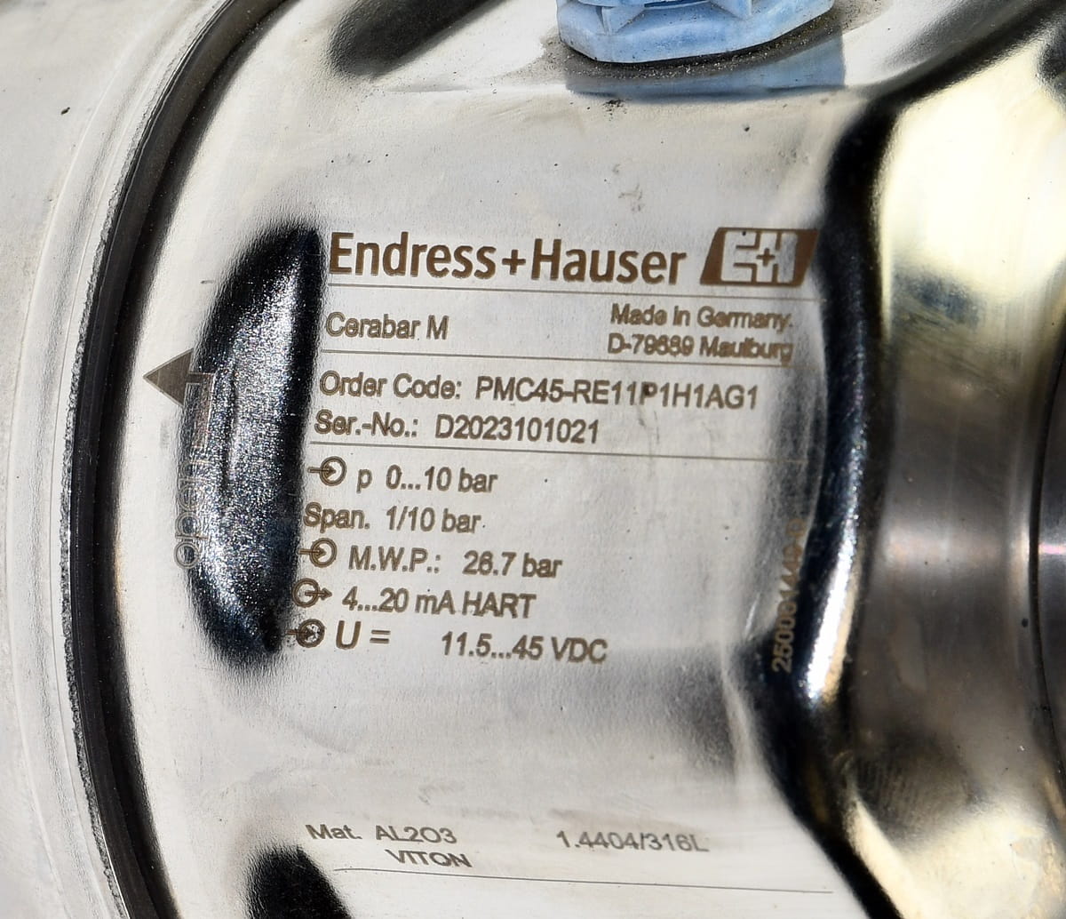 Używany, całkowicie sprawny przetwornik ciśnienia o symbolu: PMC45-RE11P1H1AG1, produkt firmy ENDRESS+HAUSER. Zakres pomiarowy przetwornika 0 do 10 barów. Odpowiedź proporcjonalna czujnika 4-20mA. Jest to przetwornik z suchym ceramicznym czujnikiem pojemnościowym, jest stosowany w instalacjach procesowych i higienicznych do pomiaru ciśnienia, poziomu, objętości lub masy cieczy i gazów. Zapewnia wysoki stopień bezpieczeństwa dzięki trwałej, odpornej na podciśnienie membranie ceramicznej z funkcją detekcji uszkodzenia membrany. W zestawie widoczna na zdjęciach opaska do montażu na rurze.