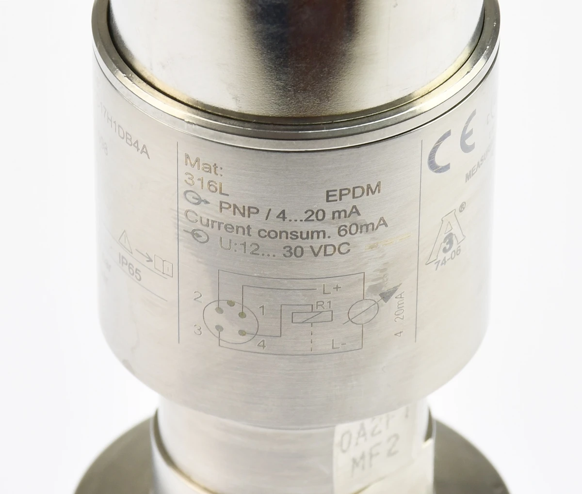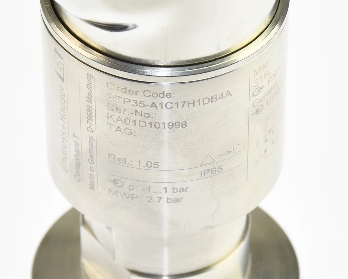 Endress+Hauser PTP35-A1C17H1DB4A czujnik ciśnienia PNP 4-20mA IP65 316L KF40 Przetwornik ciśnienia Endress+Hauser Ceraphant PTP35, kod producenta: PTP35-A1C17H1DB4A, zakres pomiarowy -1…1 bar, sygnał wyjściowy 4–20 mA / PNP, zasilanie 12–30 V DC, pobór prądu 60 mA, materiał stal nierdzewna 316L, maksymalne ciśnienie 2.7 bar, stopień ochrony IP65, przyłącze procesowe KF40, wbudowany wyświetlacz. Pochodzi z likwidowanych zasobów magazynu utrzymania ruchu.