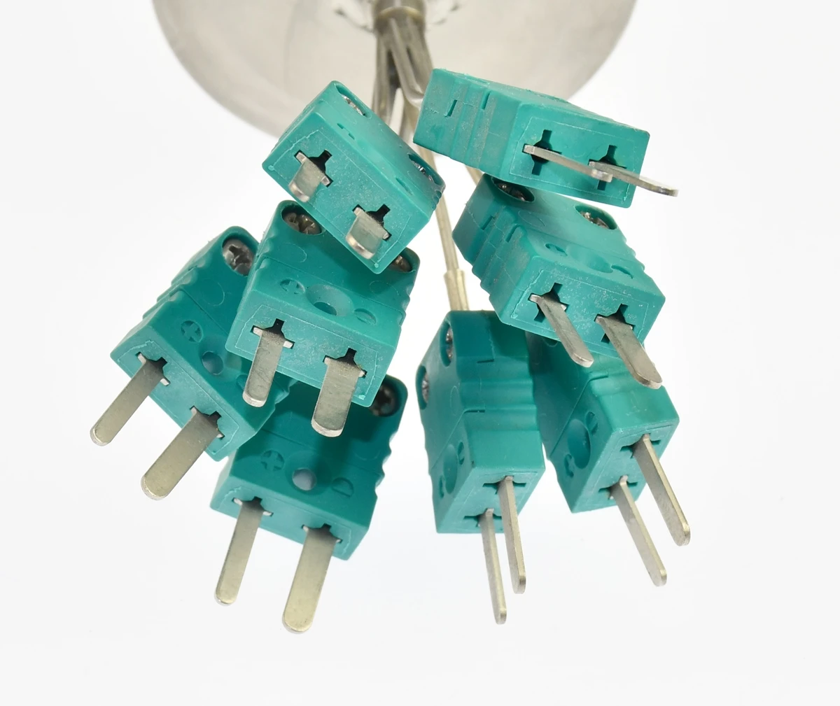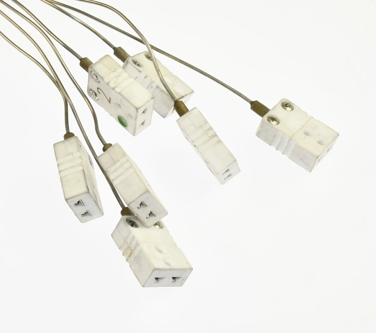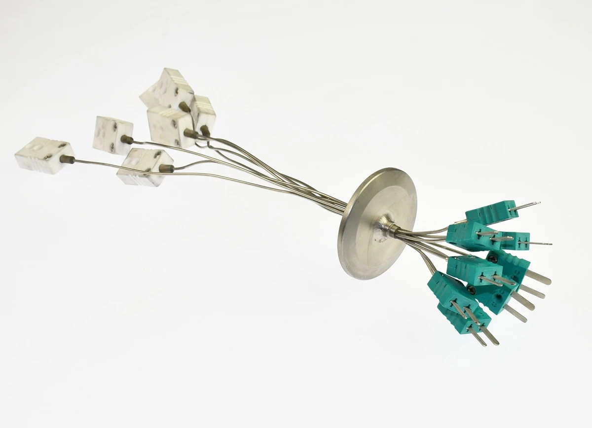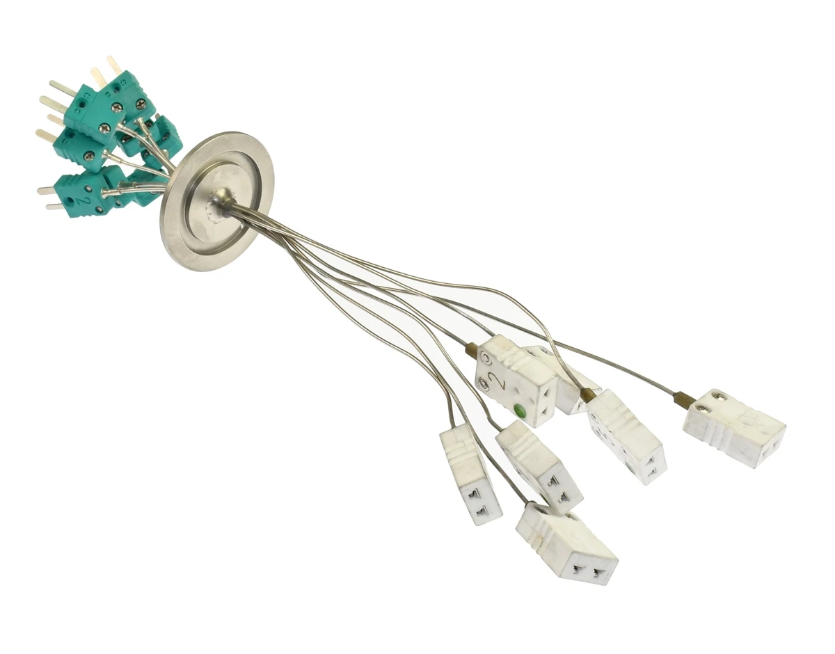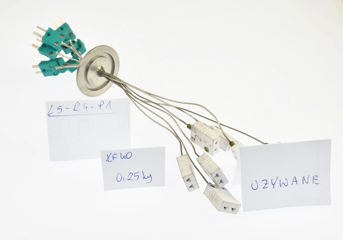 Próżniowy przepust sygnałowy w złączu próżniowym ISO KF40 wykonanym ze stali 316L, siedem niezależnych torów kompensacyjnych dla czujników termoparowych temperatury typu K z gniazdkami kompensacyjnymi męskim i żeńskim z obu stron. Gniazda po stronie próżni odporne także na wysoką temperaturę.