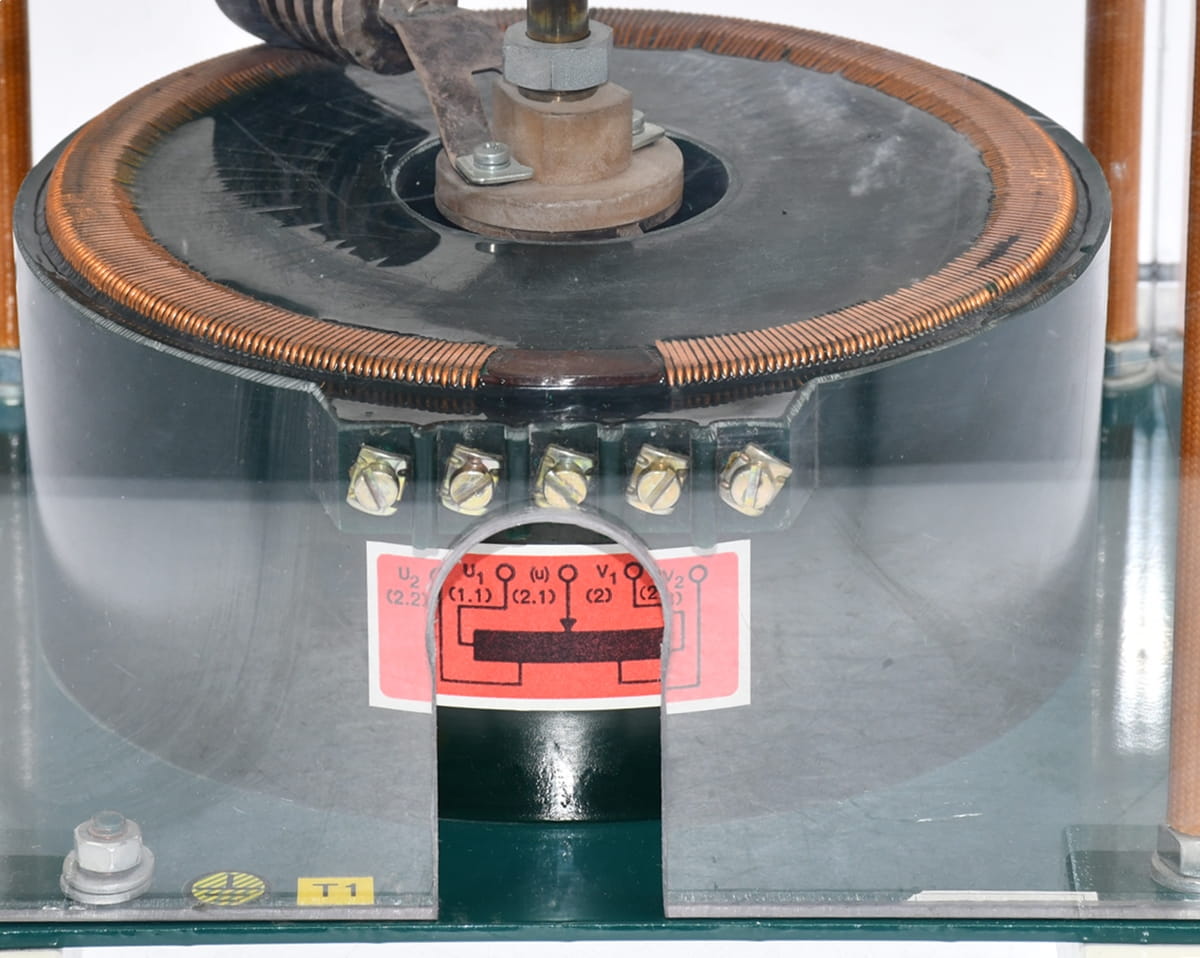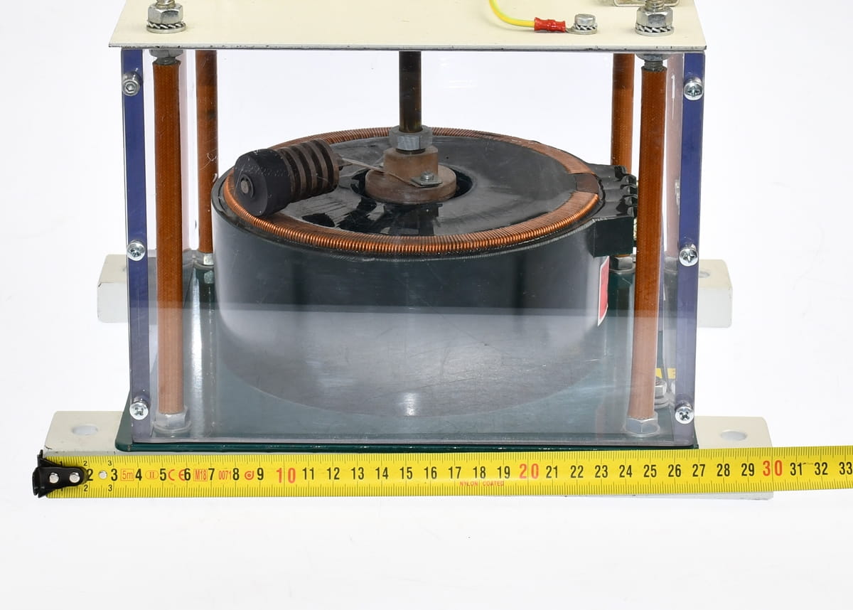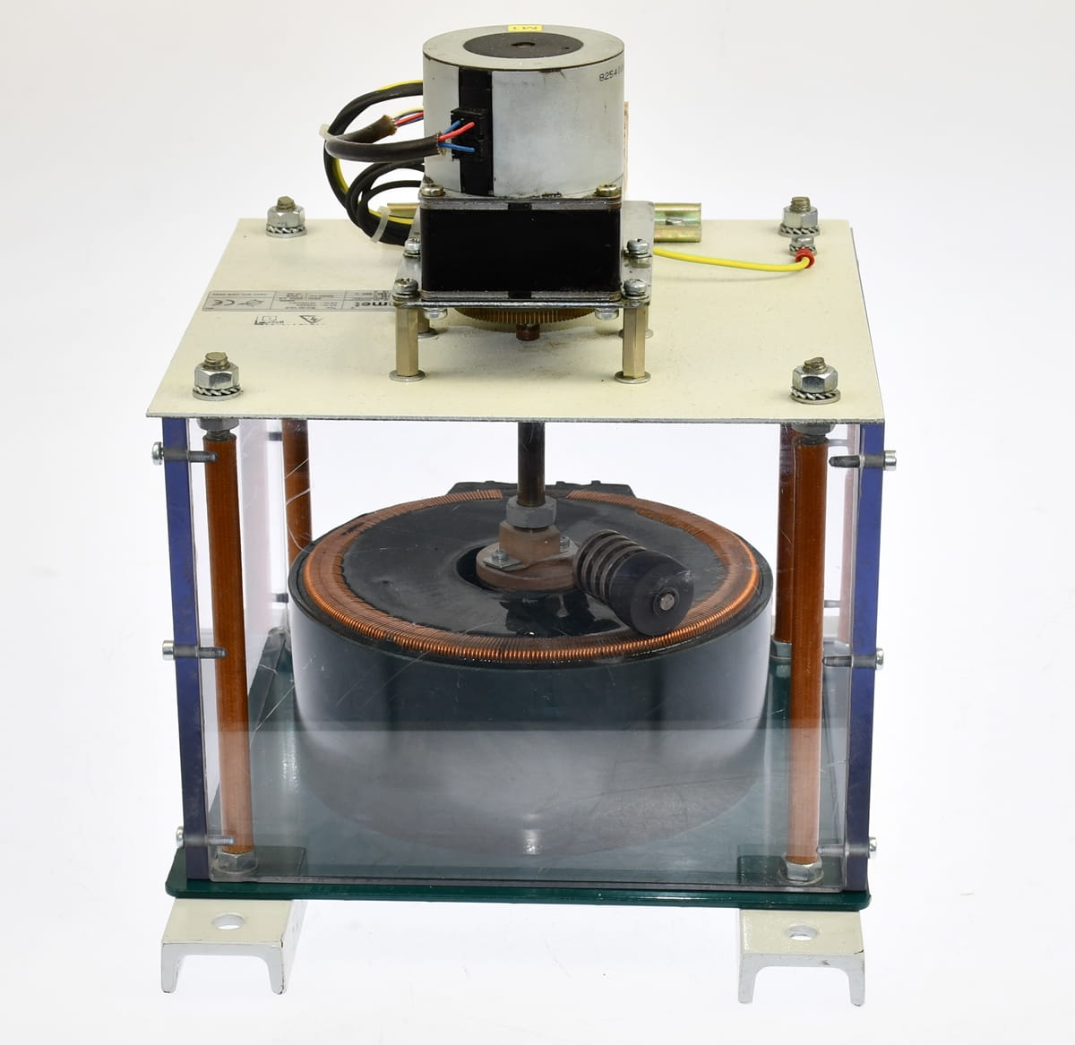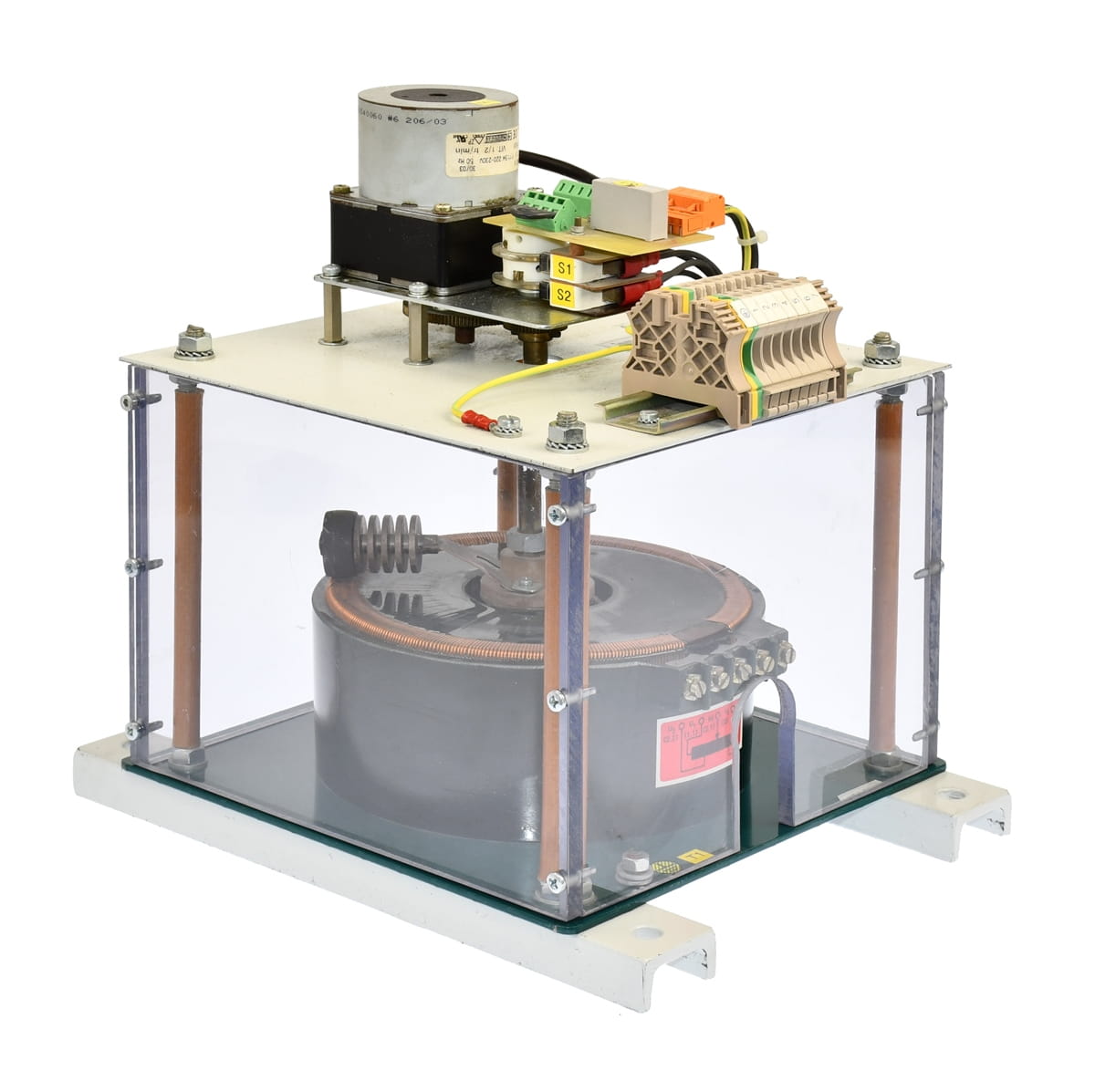 Używany, całkowicie sprawny i w idealnym stanie regulowany transformator - autotransformator z napędem elektrycznym i czujnikami krańcowymi. Produkt o oznaczeniu: RU-M 10,0, producent: ismet. Napięcie zasilania AC 230V, na wyjściu 0 - 230V z wydajnością prądu do 10A. Komutator obrotowy, grafitowy z radiatorem - najbardziej niezawodny układ. Silnik napędowy umożliwiający zdalną regulację: 80547.0 firmy Crouzet. Zasilany też napięciem 230V, na pokładzie jest wymagany kondensator. Są też dwa przełączniki sygnalizujące skrajne położenia. W zestawie jest także widoczna na zdjęciach obudowa.
