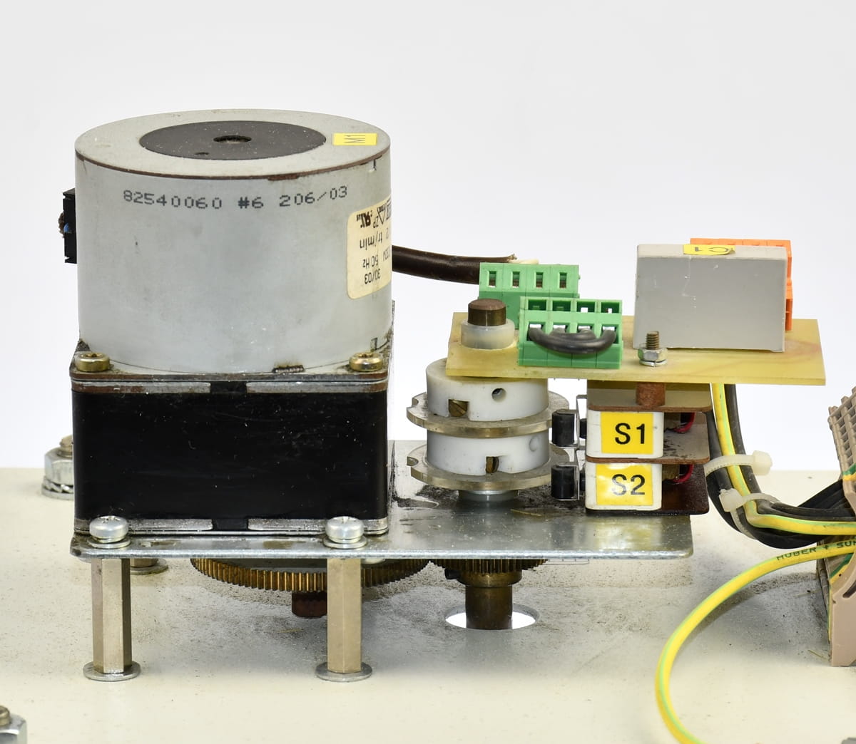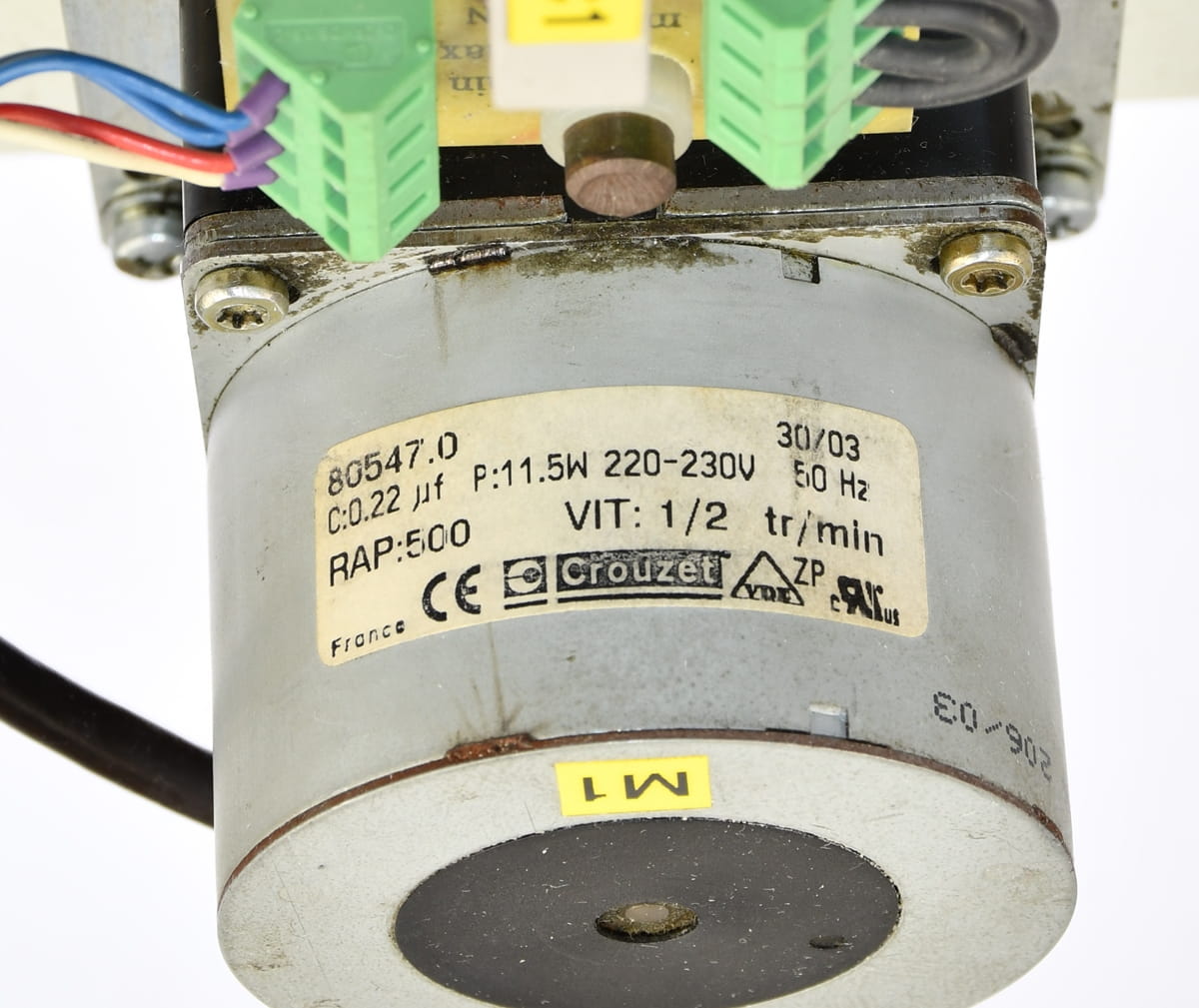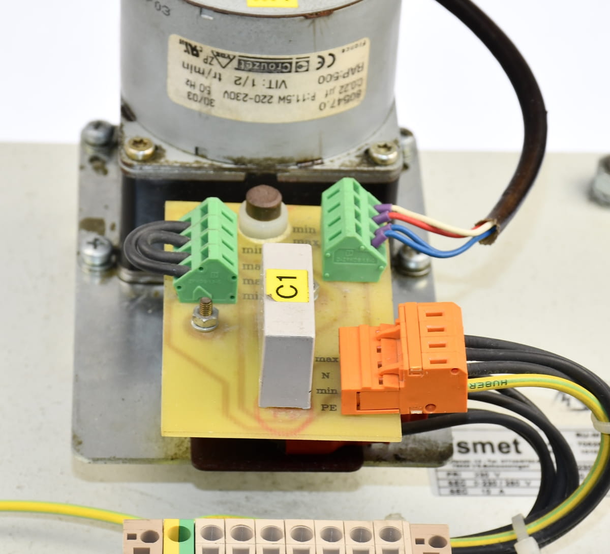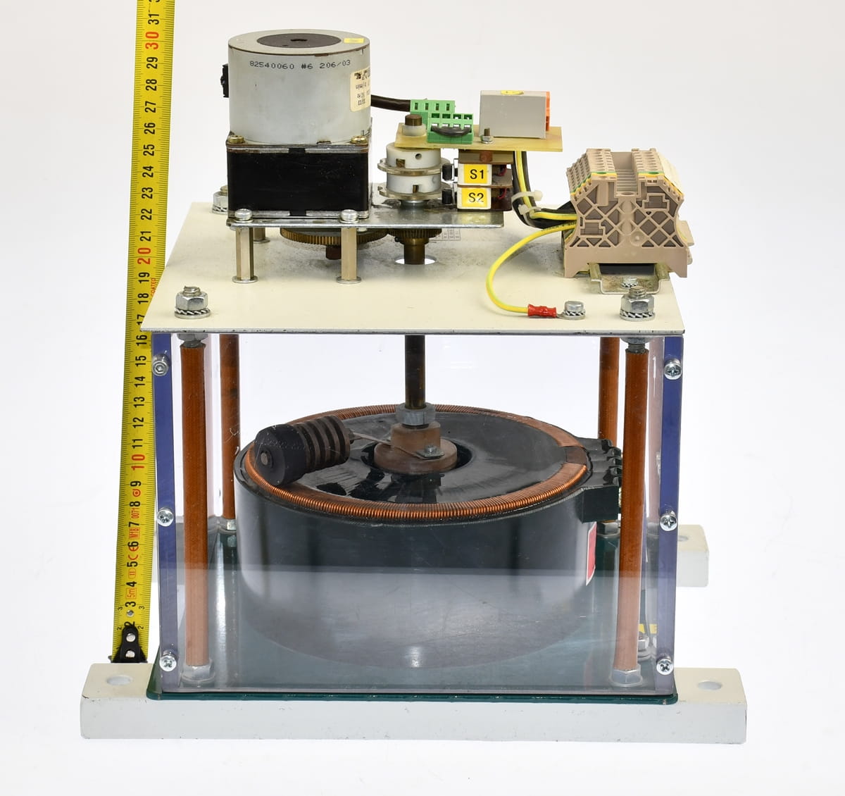 Używany, całkowicie sprawny i w idealnym stanie regulowany transformator - autotransformator z napędem elektrycznym i czujnikami krańcowymi. Produkt o oznaczeniu: RU-M 10,0, producent: ismet. Napięcie zasilania AC 230V, na wyjściu 0 - 230V z wydajnością prądu do 10A. Komutator obrotowy, grafitowy z radiatorem - najbardziej niezawodny układ. Silnik napędowy umożliwiający zdalną regulację: 80547.0 firmy Crouzet. Zasilany też napięciem 230V, na pokładzie jest wymagany kondensator. Są też dwa przełączniki sygnalizujące skrajne położenia. W zestawie jest także widoczna na zdjęciach obudowa.