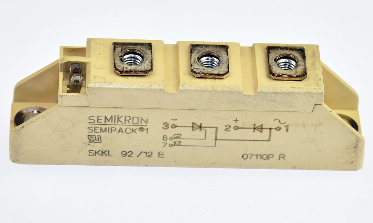 Używany, całkowicie sprawny moduł tyrystorowy renomowanej firmy SEMIKRON o symbolu: SKKL 92/12 E. Jeden tyrystor i zintegrowana dioda szeregowa. Prąd 92A, napięcie do 1,2kV. Pochodzą z demontażu całkowicie sprawnych maszyn przemysłowych. Testowany w naszej pracowni.
