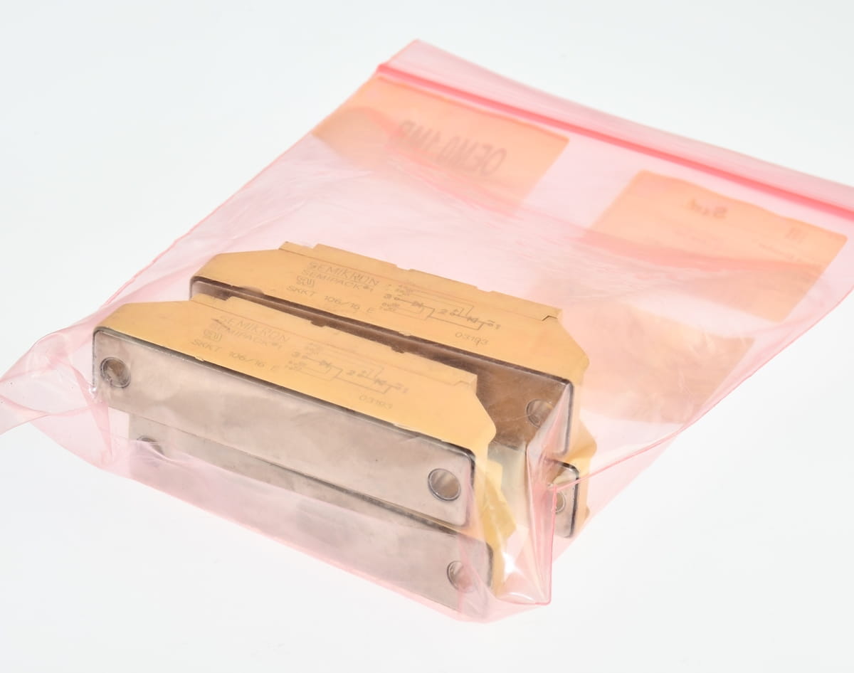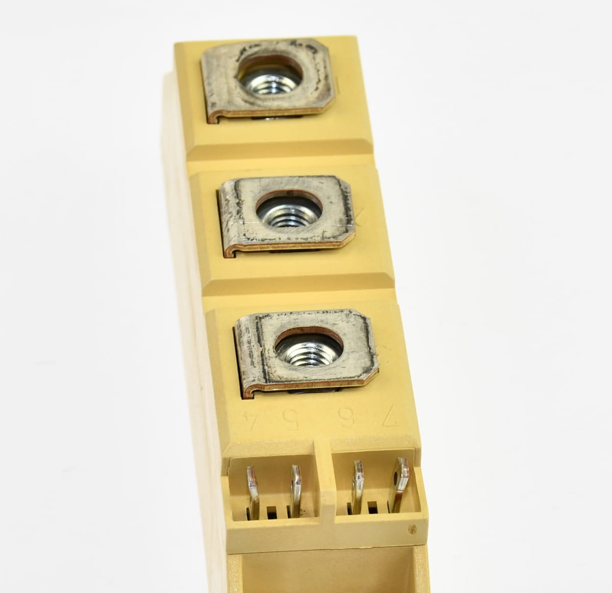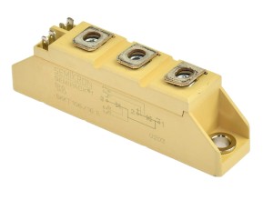 Używany, całkowicie sprawny podwójny moduł tyrystorowy renomowanej firmy SEMIKRON o symbolu: SKKT 106/16 E. Maksymalny prąd 106A, napięcie 1600V. Pochodzi ze sprawnego zasilacza. Testowane w naszej pracowni pod obciążeniem.