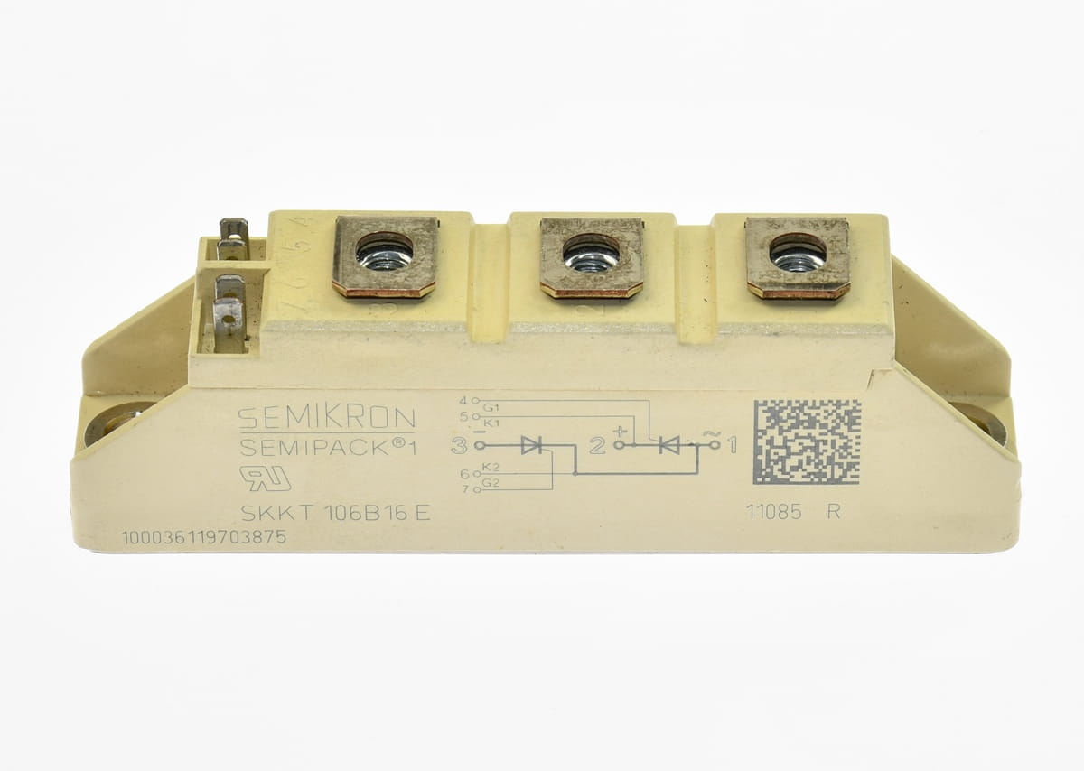 Używany, całkowicie sprawny podwójny moduł tyrystorowy renomowanej firmy SEMIKRON o symbolu: SKKT 106B/16E. Tyrystor na maksymalny prąd przewodzenia 106A i napięcie 1600V. Pochodzi z demontażu całkowicie sprawnych urządzeń przemysłowych.