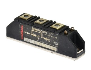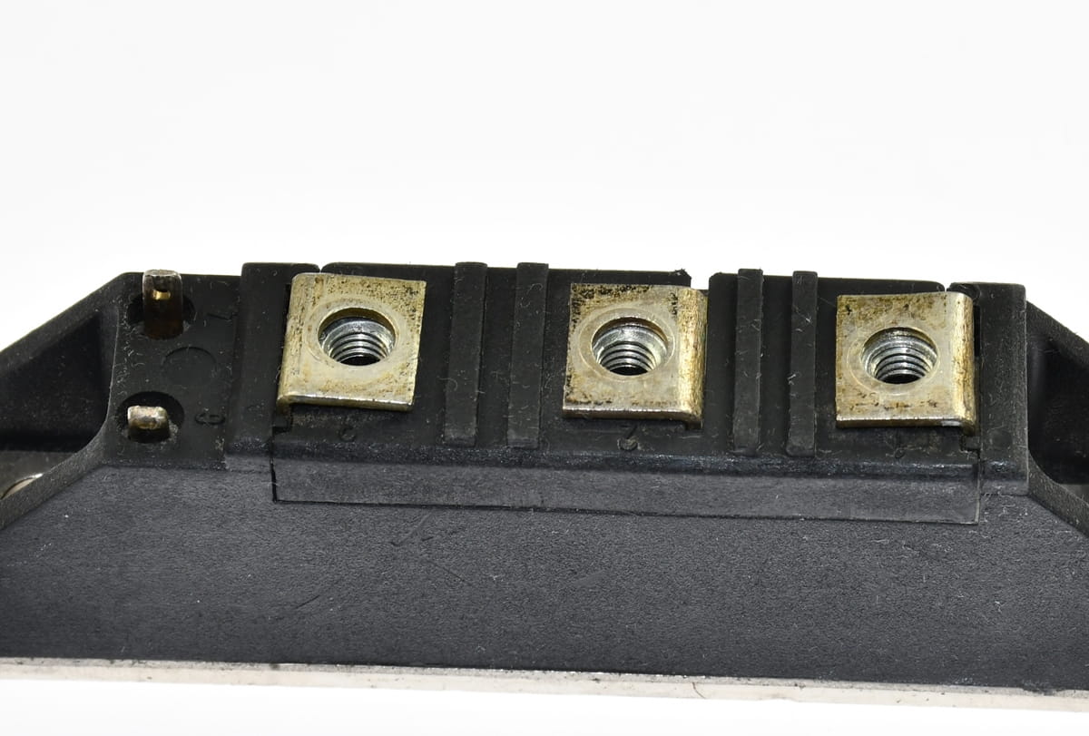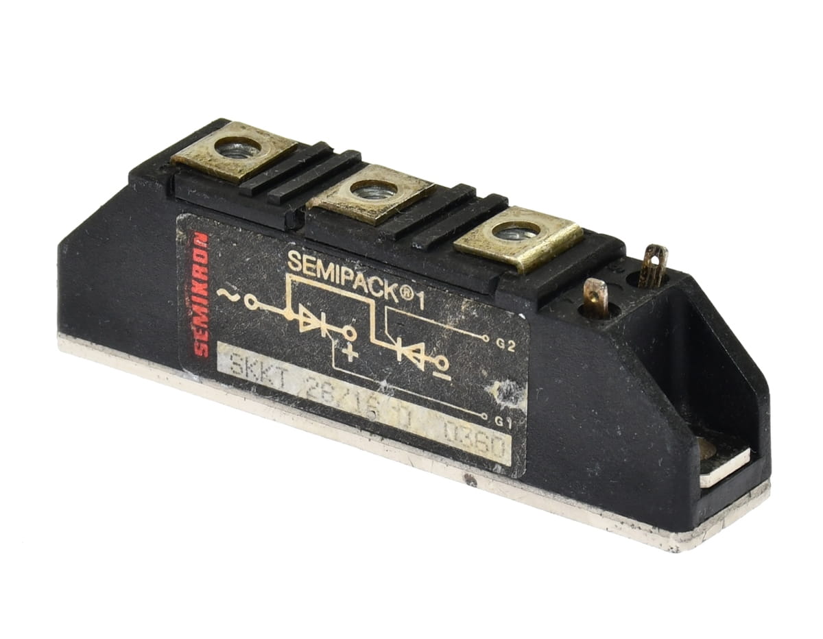 Używany, całkowicie sprawny podwójny moduł tyrystorowy renomowanej firmy SEMIKRON o symbolu: SKKT 28/16 D. Maksymalny prąd obciążenia 26A, maksymalne napięcie pracy 1600V. Pochodzi ze sprawnego zasilacza.