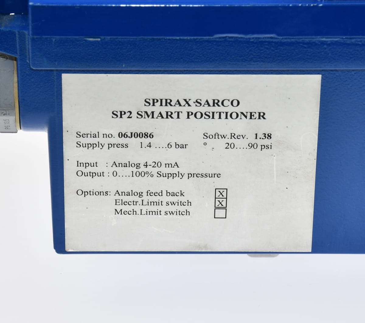 Nie używany, całkowicie sprawny element o oznaczeniu: SP2, produkt firmy Spirax Sarco. Elektropneumatyczny, proporcjonalny pozycjoner zaworu z wejściem sygnału 4...20mA. Serial no. 06J0086. Wersja oprogramowania 1.38. W swoim oryginalnym opakowaniu, pochodzi z likwidowanych zasobów magazynu utrzymania ruchu.