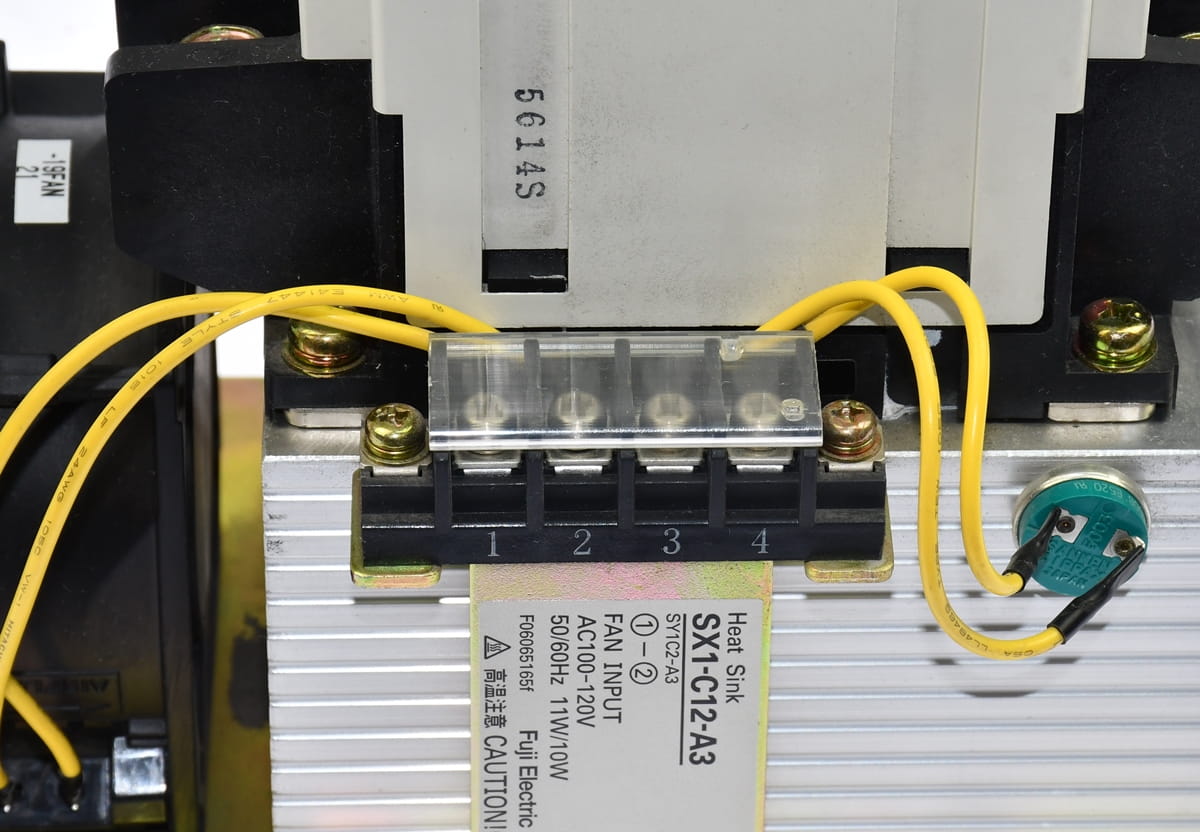 Używany element o symbolu: SS802-3Z-D3, producent: Fuji Electric, Stycznik trójfazowy elektroniczny SSR, prąd do 80A przy napięciu do 240V. W zestawie jest radiator z wentylatorem: SX1-C12-A3. Nie jest przystosowany do pracy z napięciem trójfazowym w Polsce, gdzie jest napięcie 400V, można zastosować go u nas na obwodach jednofazowych.
