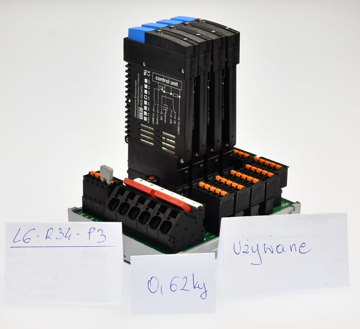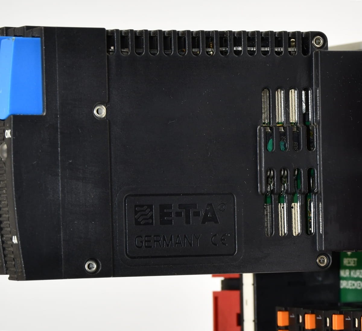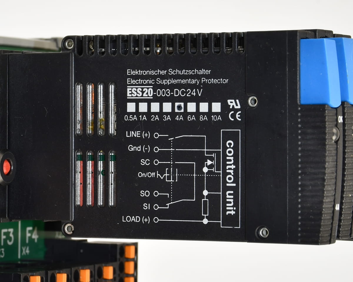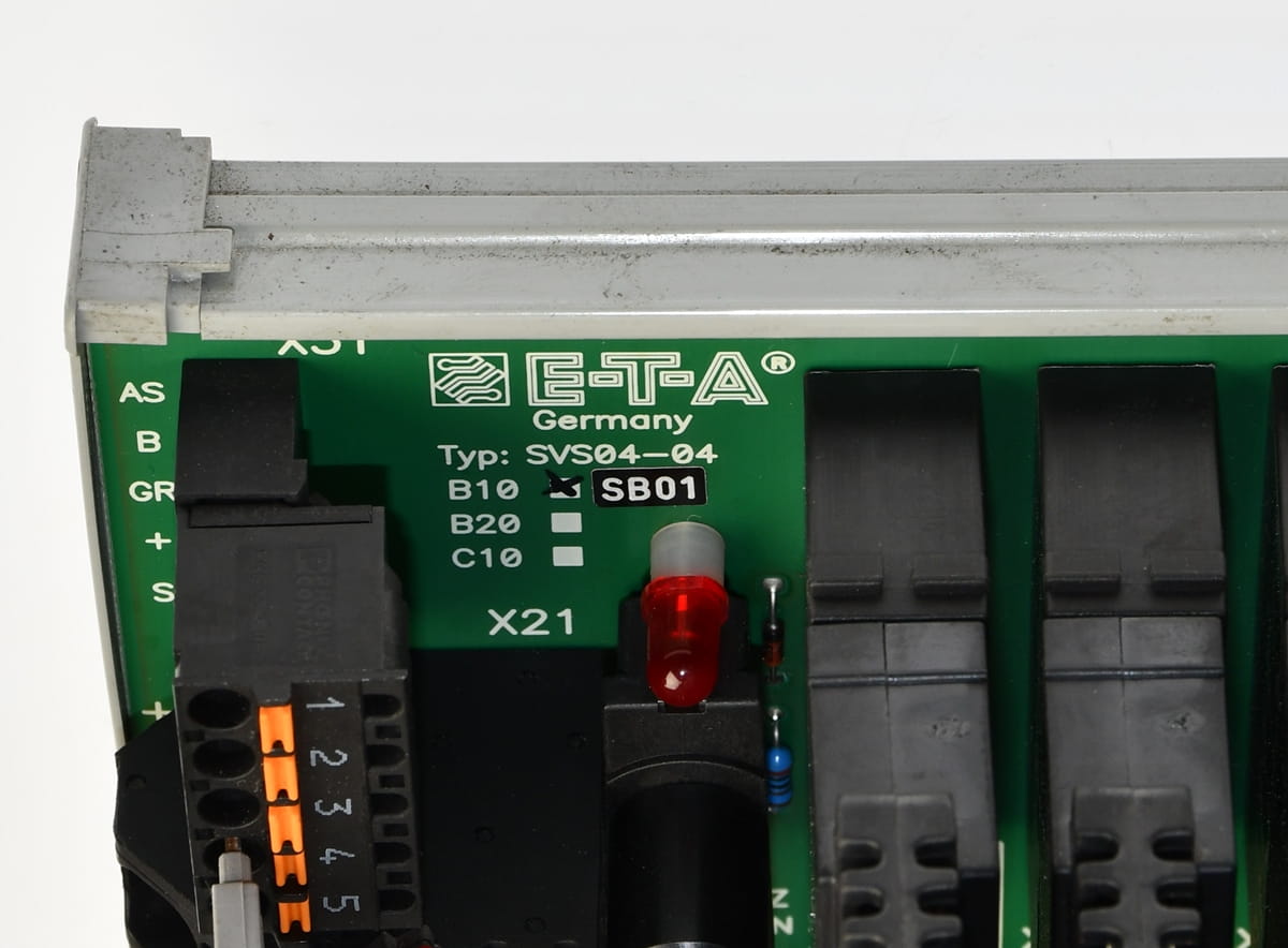 Używany, całkowicie sprawny element o oznaczeniu: SVS04-04 produkt firmy E-T-A - Dystrybutor mocy o zestawie z czterema kartami o oznaczeniu: ESS20-003-DC24V /4A - półprzewodnikowy rozłącznik obwodu wyprodukowany również przez firmę E-T-A. Pochodzi z demontażu całkowicie sprawnych maszyn przemysłowych.