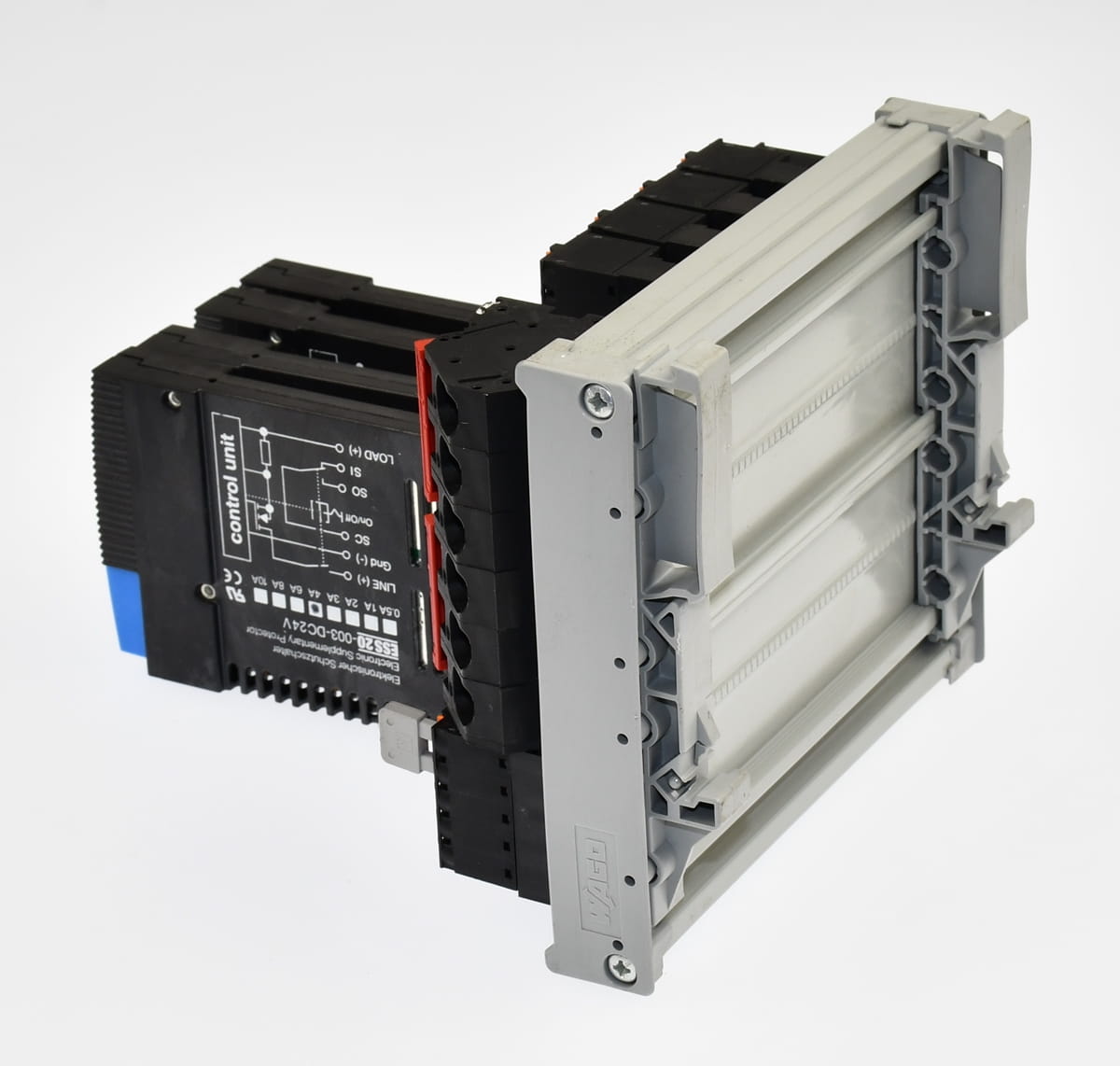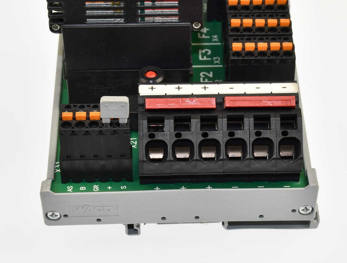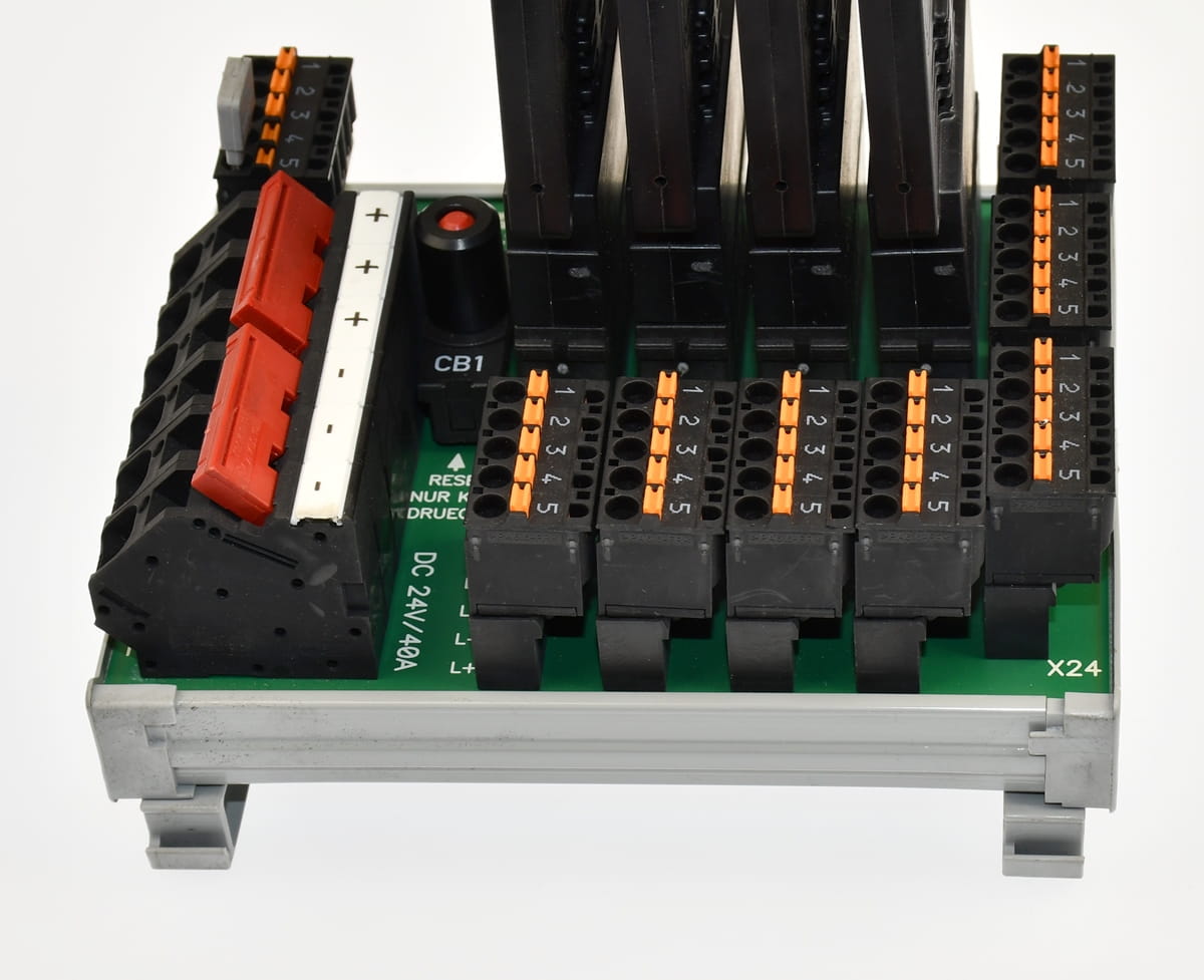 Używany, całkowicie sprawny element o oznaczeniu: SVS04-04 produkt firmy E-T-A - Dystrybutor mocy o zestawie z czterema kartami o oznaczeniu: ESS20-003-DC24V /4A - półprzewodnikowy rozłącznik obwodu wyprodukowany również przez firmę E-T-A. Pochodzi z demontażu całkowicie sprawnych maszyn przemysłowych.