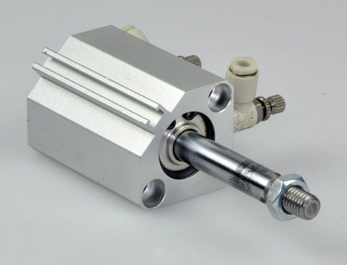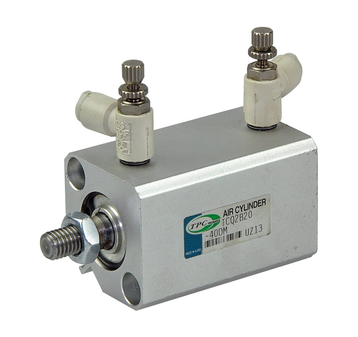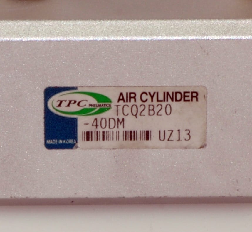 Używany, całkowicie sprawny siłownik pneumatyczny obustronnego działania o symbolu: TCQ2B20-40DM renomowanej firmy TPC Pneumatics. W zestawie z siłownikiem dwie szybkozłączki do podłączenia przewodów sprężonego powietrza zespolone z regulatorami przepływu określającymi prędkość pracy siłownika.