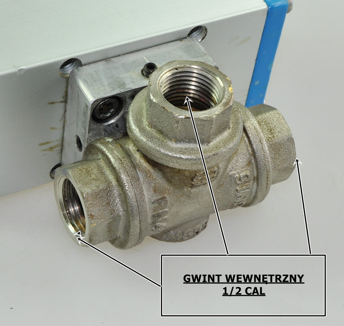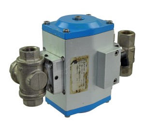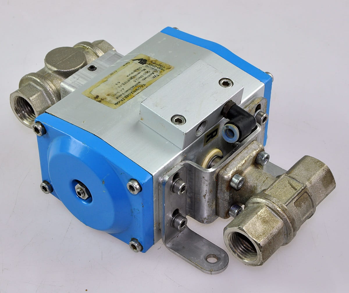 Używany ale całkowicie sprawny duży aktuator pneumatyczny o symbolu: TKOMB2-04ETF-06I, produkt firmy MIT. Jest zespolony z dwoma zaworami kulowymi jednodrożnym i trzy drożnym z przyłączami 1/2 cala.