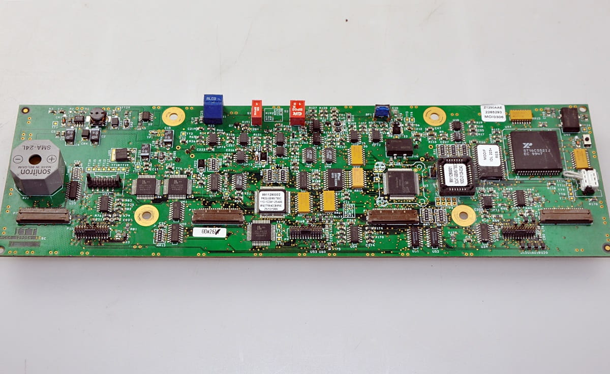 Używany, całkowicie sprawny moduł elektroniczny na którym znajdziemy m.in 10 sztuk przekaźników SMD o symbolu: TQ2SA-5V firmy NAiS.