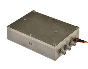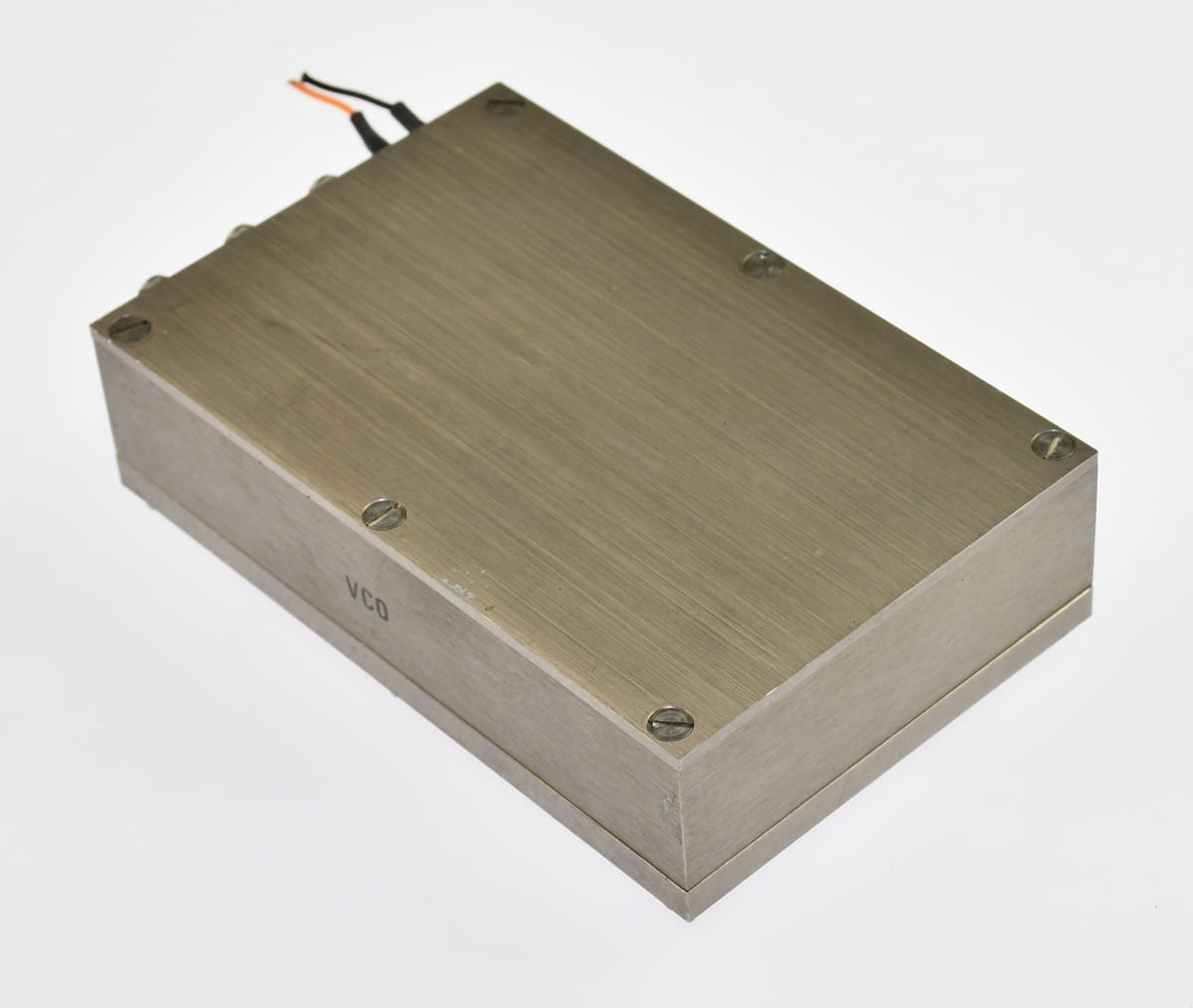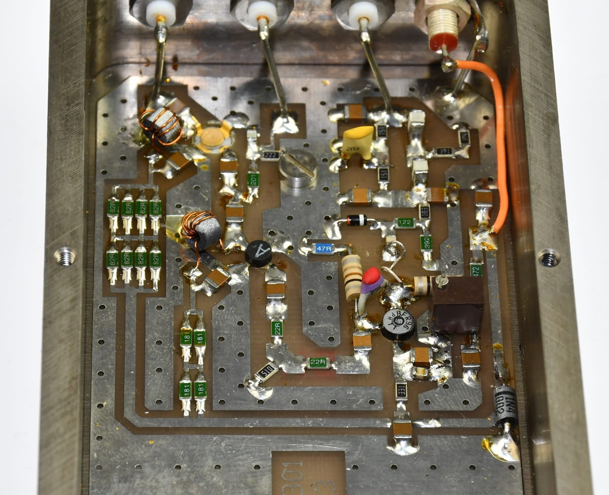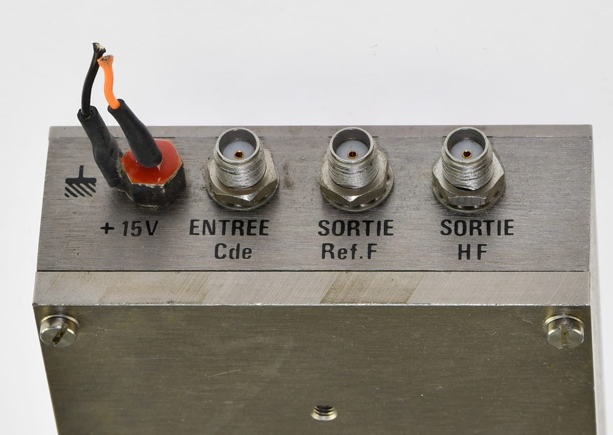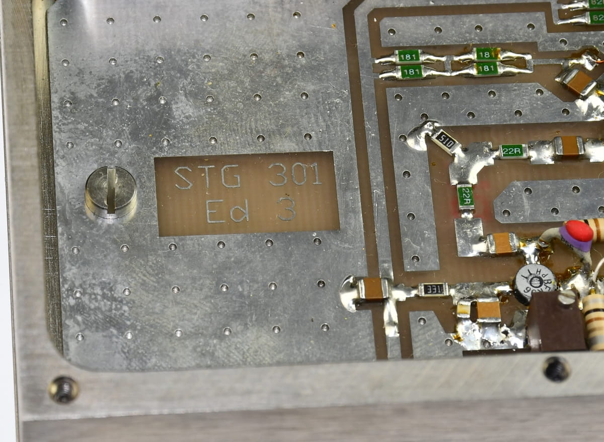 Używany, pochodzący z demontażu sprawnej maszyny przemysłowej modulator / generator VCO RF, symbol na płytce: TSG 301. W metalowej obudowie z wtyczkami w.cz.