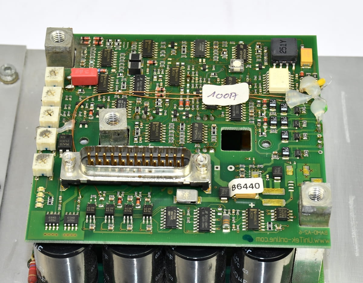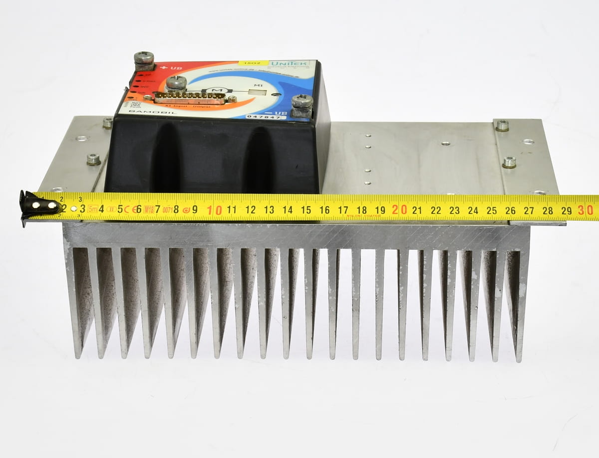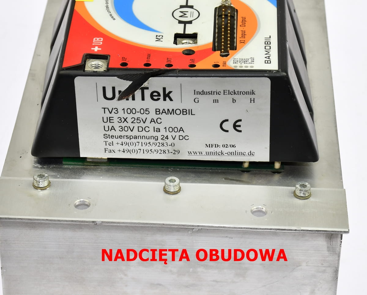 Używany, całkowicie sprawny moduł energoelektroniczny o oznaczeniu: TV3 100-05 BAMOBIL, produkt firmy UniTek. Moduł przykręcony do masywnego radiatora aluminiowego. Pochodzi z demontażu całkowicie sprawnych maszyn przemysłowych. Sprzedawany w tej ofercie model ma nieco uszkodzoną obudowę, co pokazano na zdjęciu Nr. 12