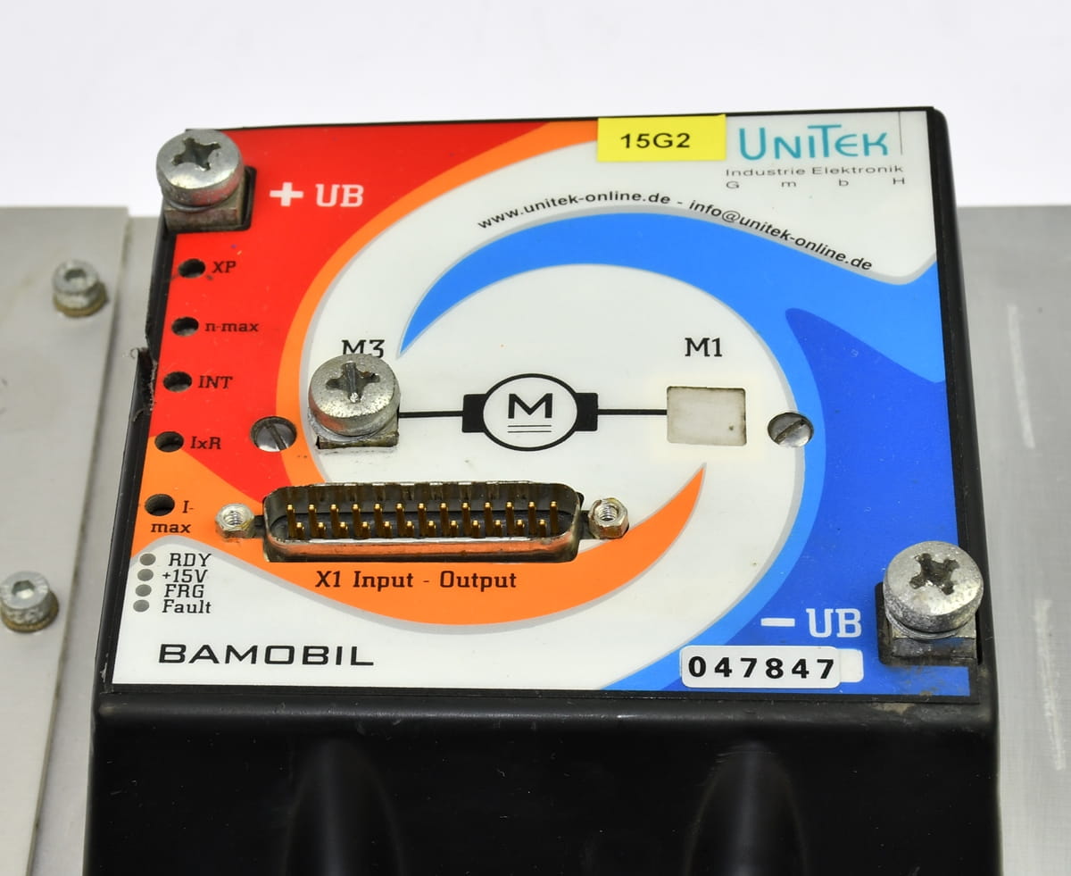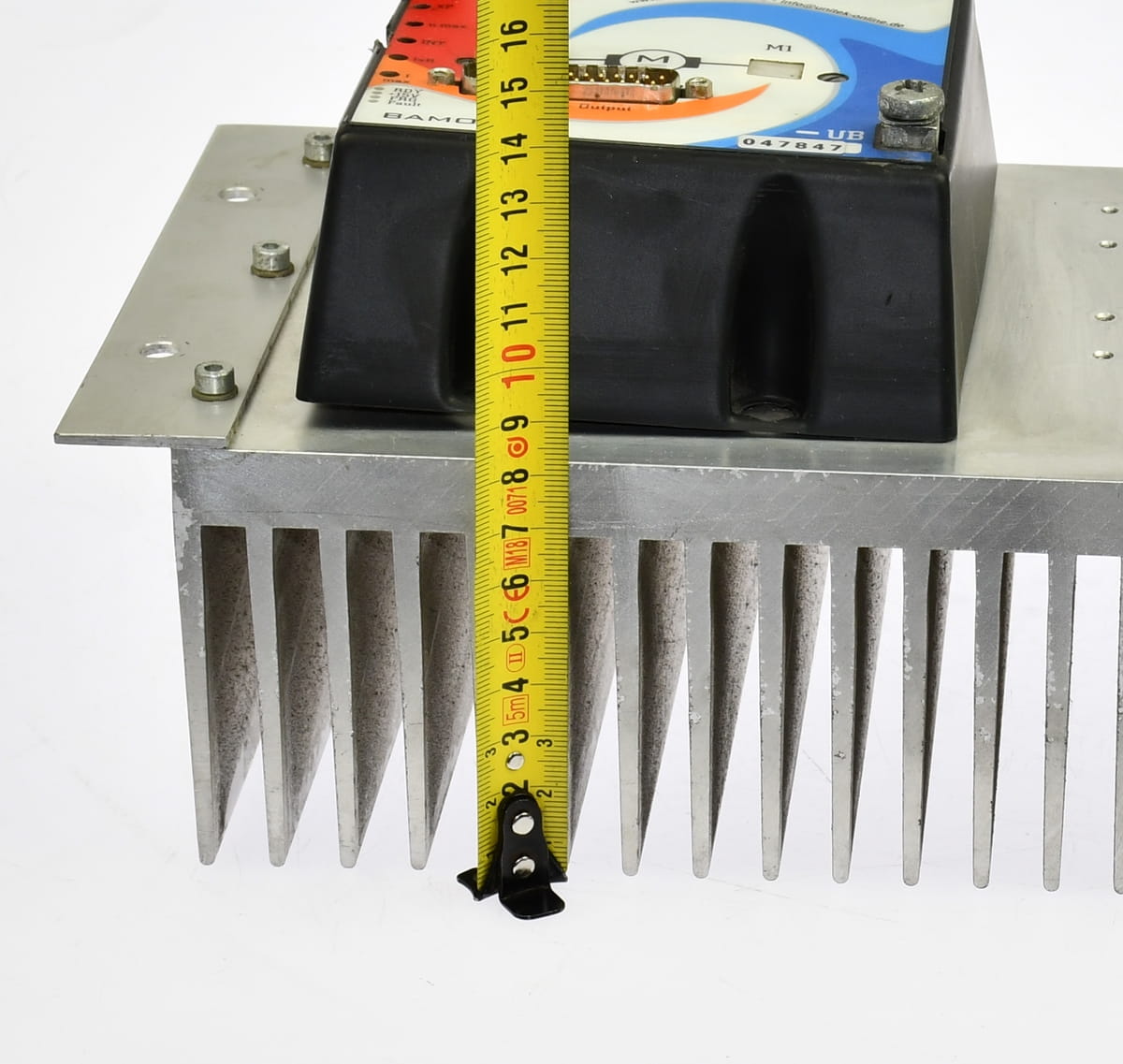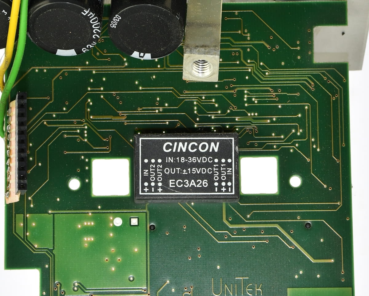 Używany, całkowicie sprawny moduł energoelektroniczny o oznaczeniu: TV3 100-05 BAMOBIL, produkt firmy UniTek. Moduł przykręcony do masywnego radiatora aluminiowego. Pochodzi z demontażu całkowicie sprawnych maszyn przemysłowych. Sprzedawany w tej ofercie model ma nieco uszkodzoną obudowę, co pokazano na zdjęciu Nr. 12