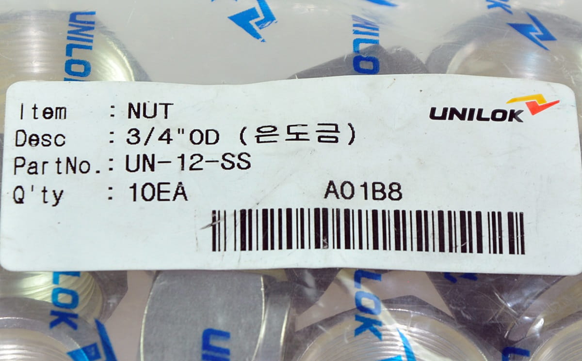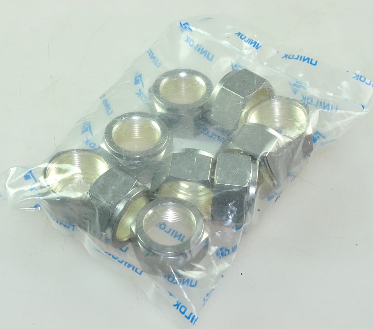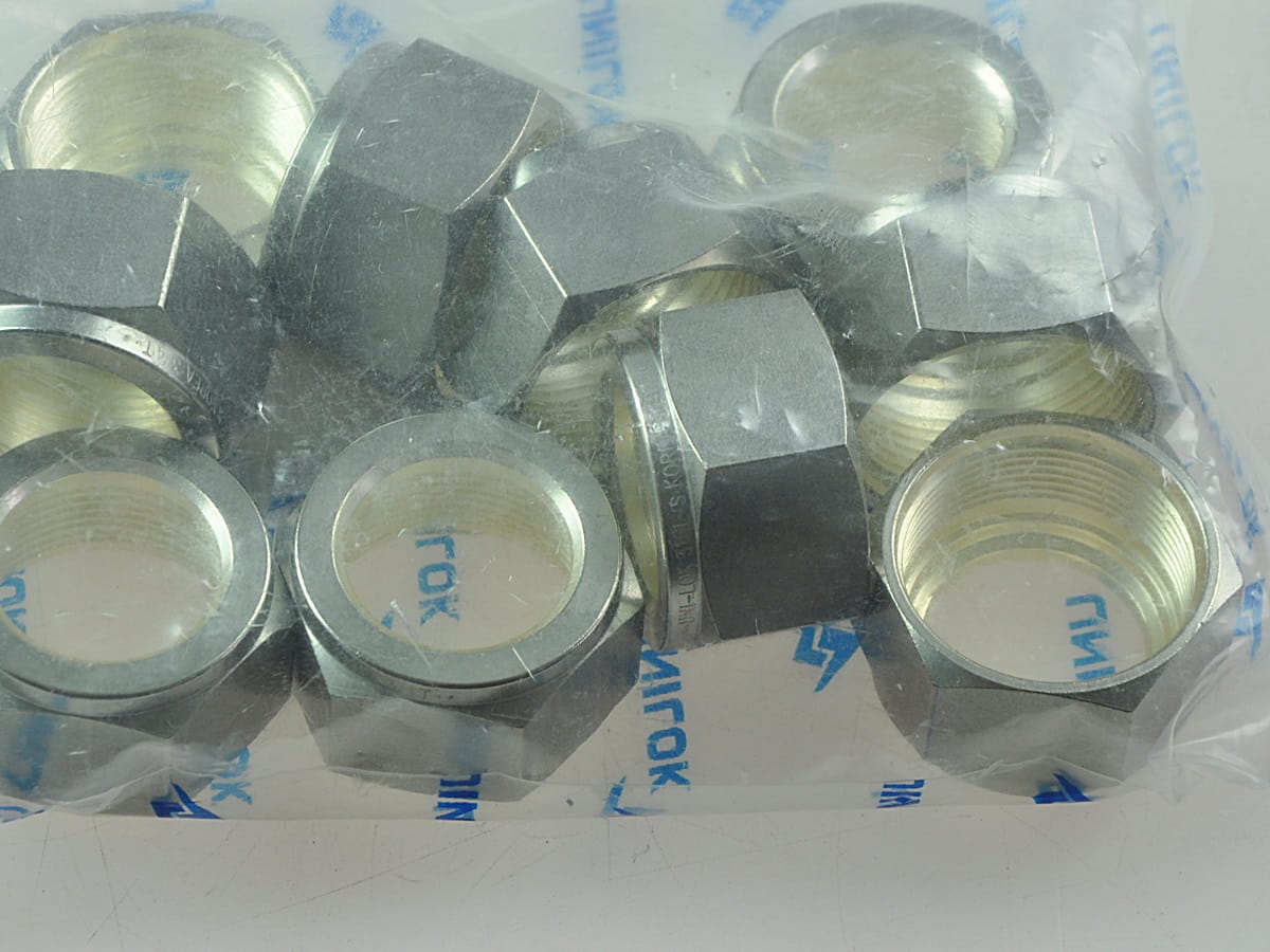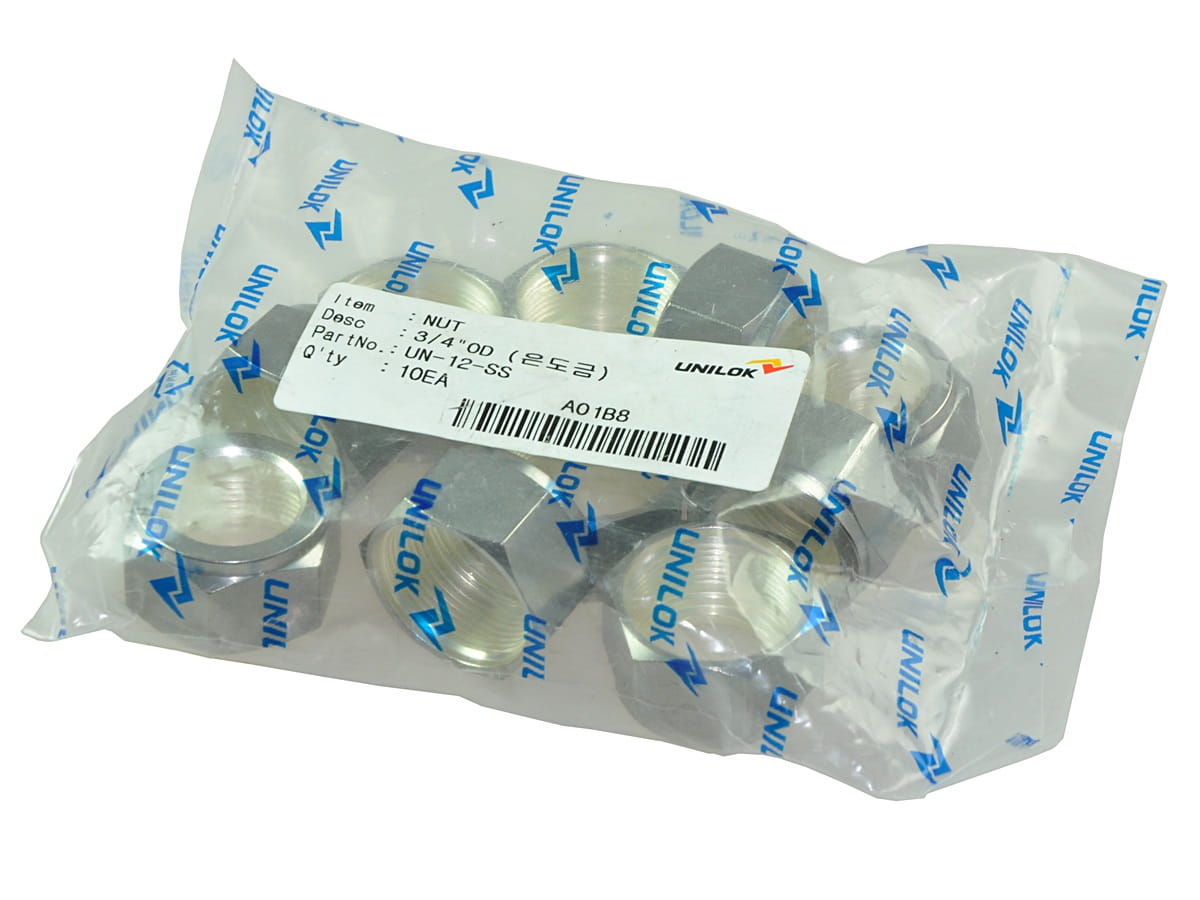 Zestaw nie używanych nakrętek złącza systemu UNILOK w ilości 10 szt, oryginalnie zapakowane. Oznaczenie producenta: UN-12-SS UNILOK. Pochodzą z likwidowanych zapasów magazynu utrzymania ruchu.