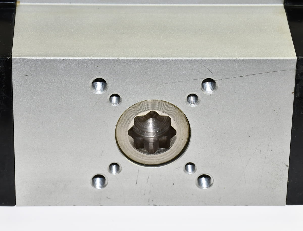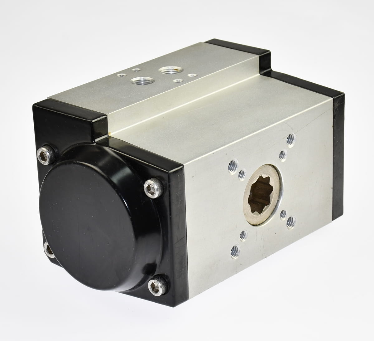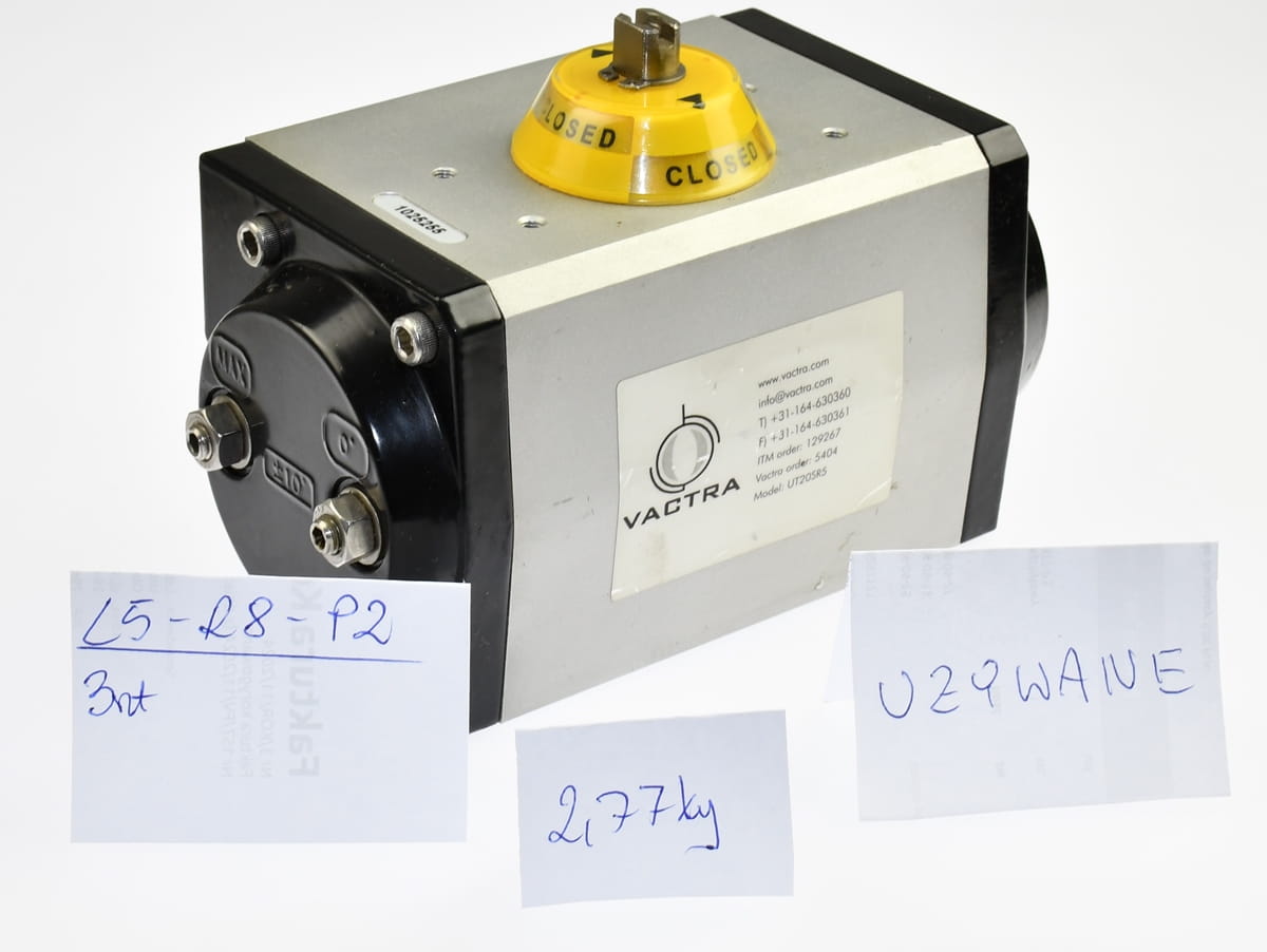 Używany element o oznaczeniu: UT20SR5, producent VACTRA, kod produktu: 1025255, Vactra order: 5404. Pneumatyczny siłownik obrotowy do napędu zaworu. Siłownik obustronnego działania, z indykatorem położenia. Pochodzi z likwidowanych zasobów magazynu utrzymania ruchu, najprawdopodobniej nie były montowane jednak posiadają bardzo delikatne zarysowania i zabrudzenia obudowy.