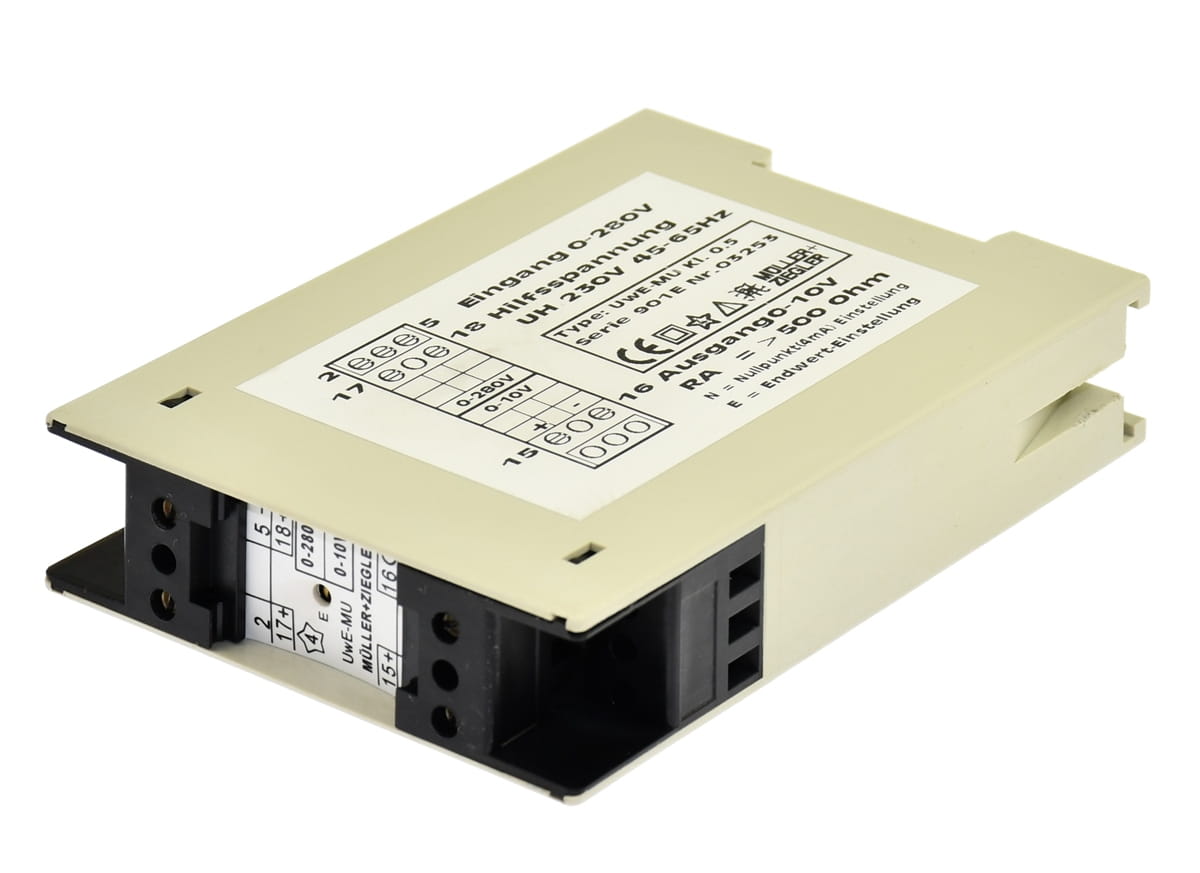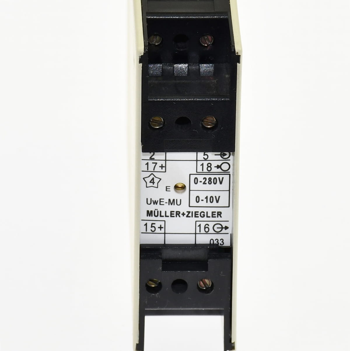 Używany, całkowicie sprawny kondycjoner / przetwornik napięcia przemiennego w zakresie 0 - 280V na sygnał proporcjonalny przyjazny dla PLC: 0 - 10V, moduł o oznaczeniu: UWE-MU 0-280VAC 0-10V, Seria: 901E. Producent: MULLER ZIEGLER.