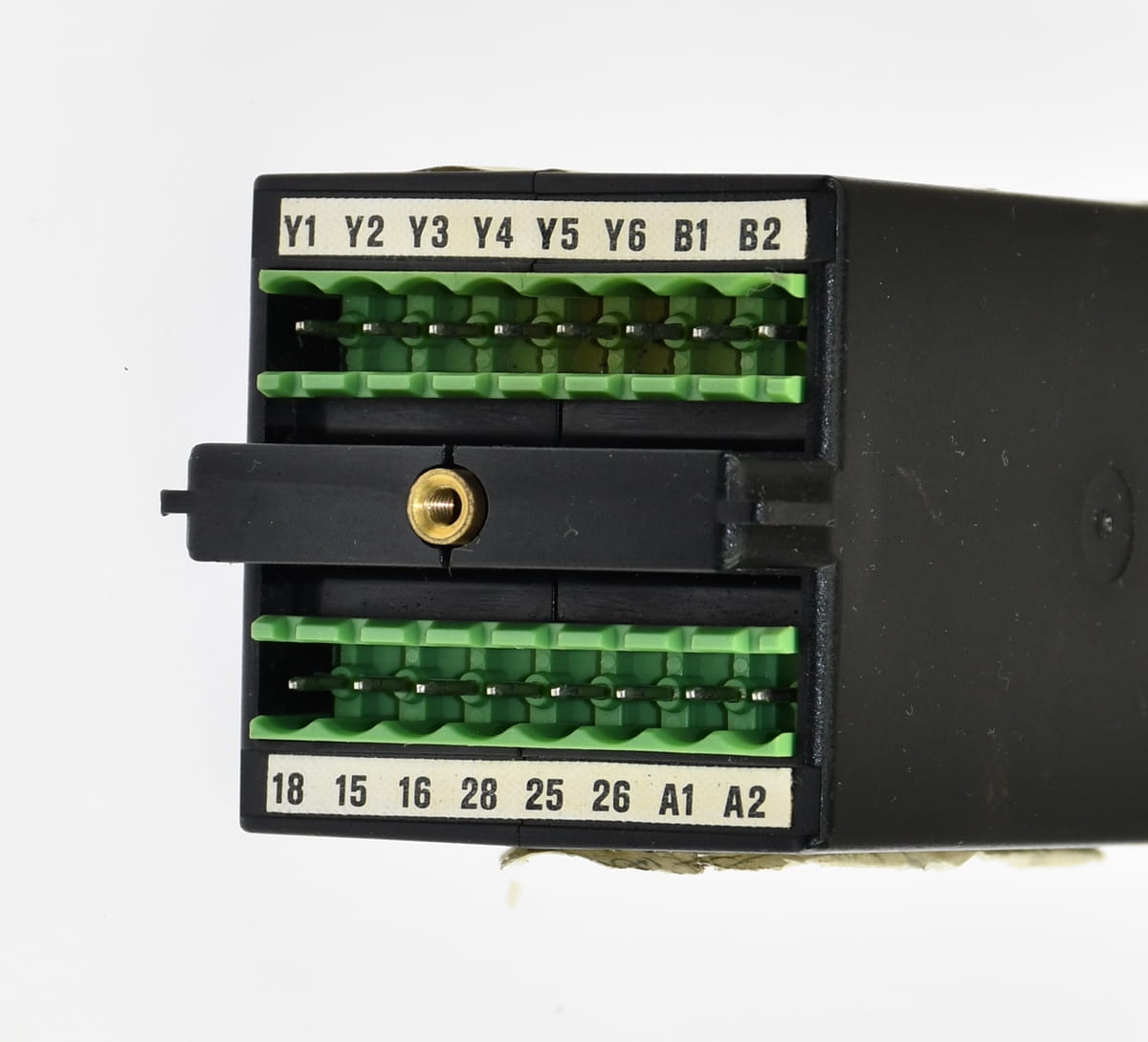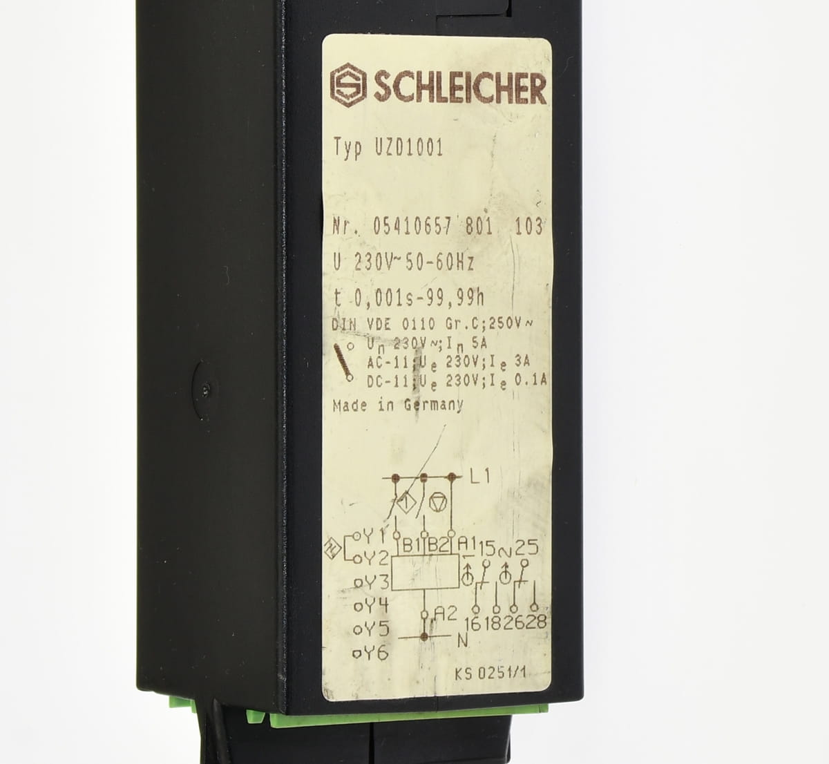 Używany, całkowicie sprawny element o oznaczeniu: UZD1001, producent SCHLEICHER. Przekaźnik czasowy o zakresie nastaw: 0,001s-99,99h, zasilanie 230V AC. Kod produktu: 05410657 801 103. Pochodzi z demontażu całkowicie sprawnych maszyn przemysłowych, w zestawie nie ma kostek podłączeniowych.