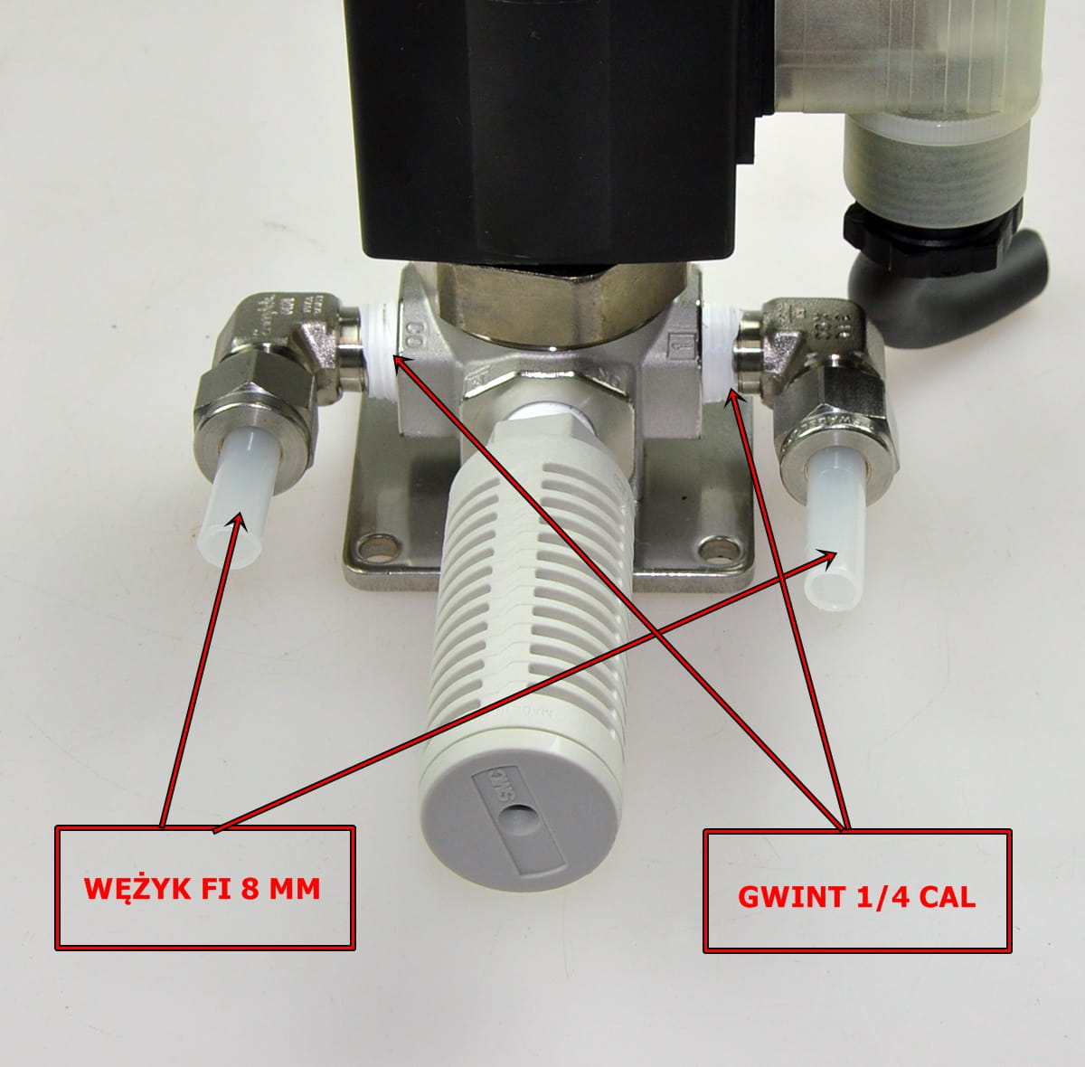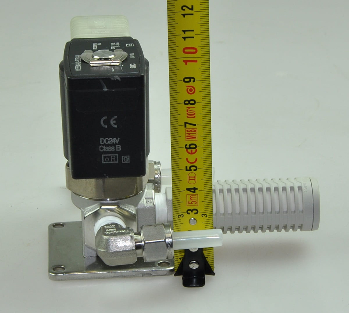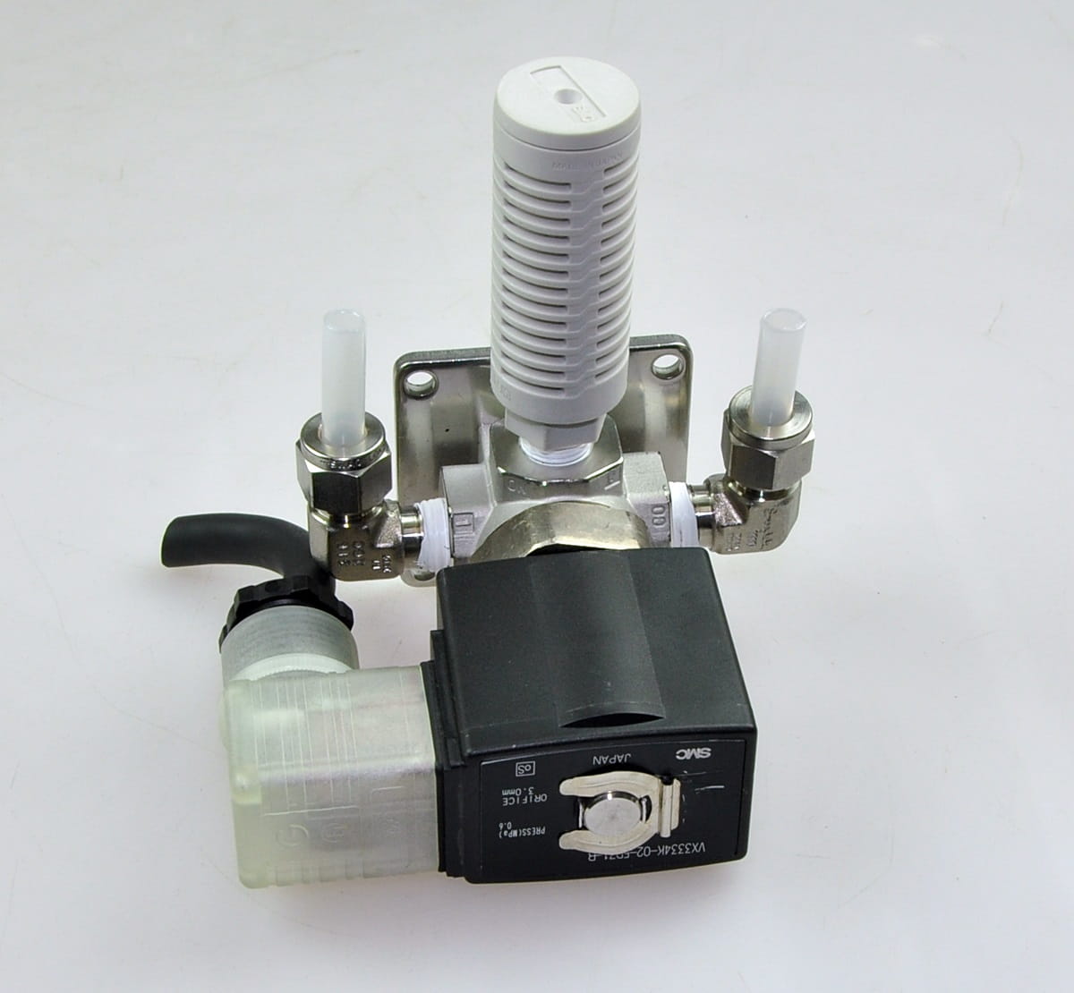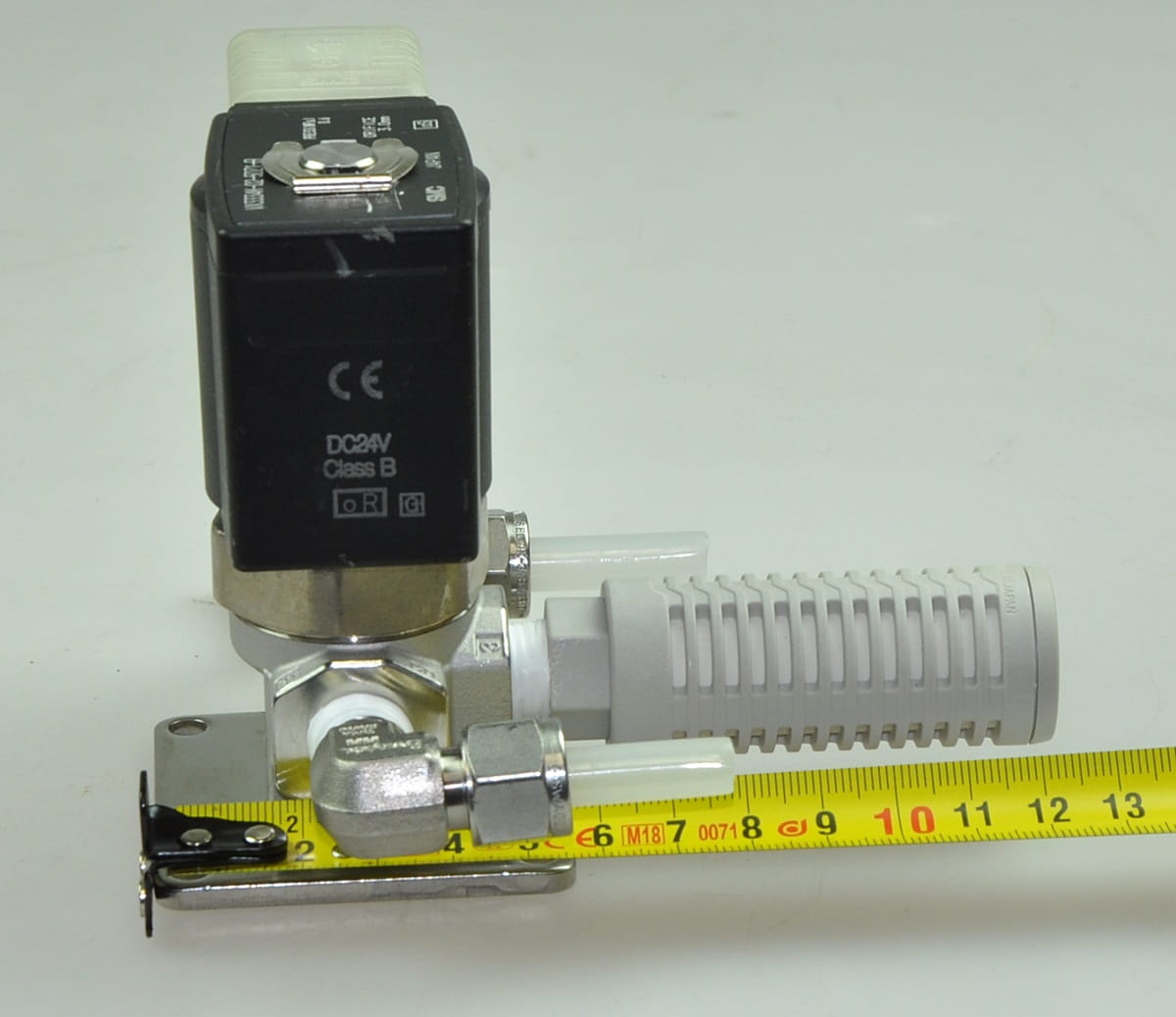 Używany, całkowicie sprawny i w idealnym stanie elektrozawór o symbolu: VX3334K-02-5DZ1-B, produkt firmy SMC. Elektrozawór trójdrogowy dla ciśnienia do 2,0 MPa. Cewka sterowana napięciem stałym 24V. W zestawie jest wtyczka do cewki, tłumik spustowy powietrza oraz dwie złączki skręcane do podłączenia elastycznego przewodu ciśnieniowego. Zawór pracował z azotem ale nadaje się także do cieczy.
