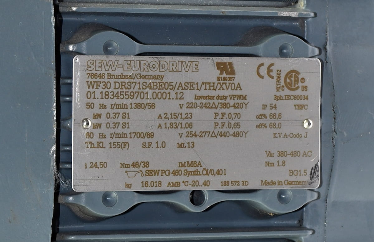 Używany, w idealnym stanie motoreduktor firmy SEW Eurodrive o oznaczeniu: WF30 DRS71S4BE05/ASE1/TH/XV0A, kod produktu: 01.1834559701.0001.12. Silnik zespolony z przekładnią o przełożeniu i 24,50. Zasilanie 380 - 480 VAC. Motoreduktor zespolony jest z enkoderem absolutnym o oznaczeniu: 6FX2001-5FD25-0AA1 firmy Siemens. Rozdzielczość tego enkodera to 34 Bity. Pochodzi z demontażu całkowicie sprawnej linii przemysłowej.