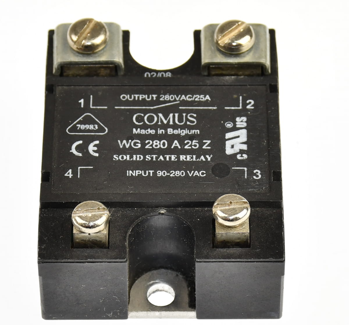 Używany, całkowicie sprawny i w idealnym stanie stycznik półprzewodnikowy SSR do sterowania jednofazowymi obwodami prądu przemiennego. Produkt o symbolu: WG280A25Z, wyprodukowany przez firmę: COMUS. Maksymalny prąd obciążenia 25A, przy napięciu do 280V. Napięcie sterujące AC w zakresie 90 - 280V. Pochodzi z demontażu całkowicie sprawnych maszyn przemysłowych.