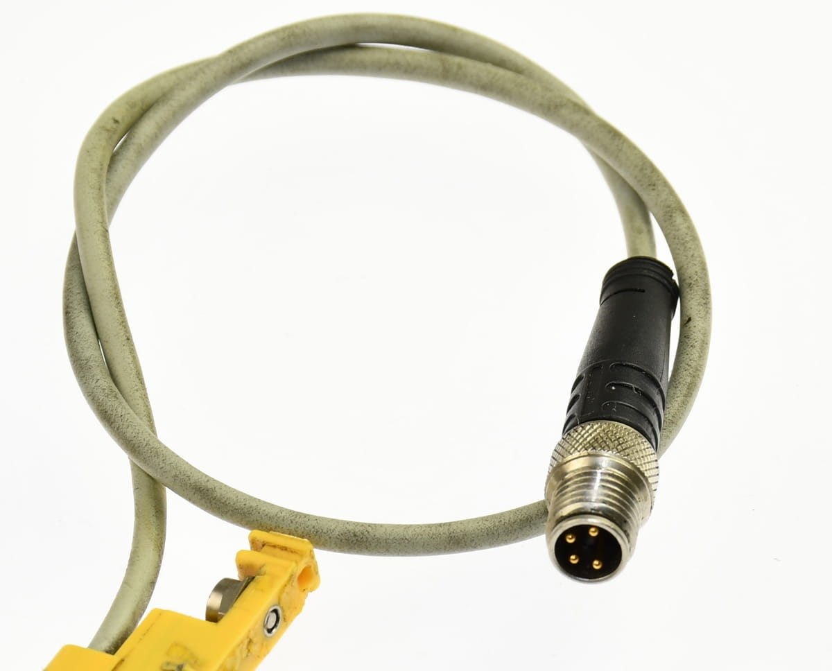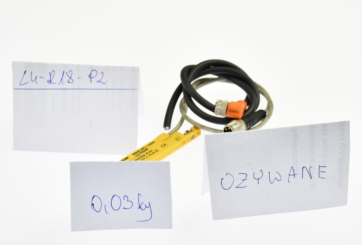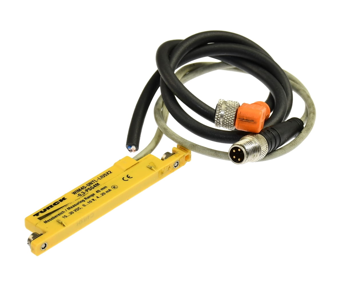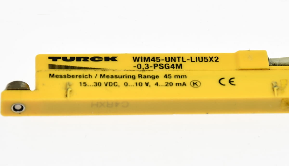 Używany, całkowicie sprawny czujnik o symbolu: WiM45-UNTL-LiU5X2-0,3-PSG4M, produkt firmy TURCK. Kod produktu: 1536620. Proporcjonalny czujnik położenia tłoka siłownika pneumatycznego. Wyjście sygnału 0...10V lub 4...20mA. Zakres pomiarowy 45mm. Pochodzi z demontażu całkowicie sprawnych maszyn przemysłowych. W zestawie jest dodatkowy kabelek o długości 0,4m z kontową, żeńską, 4-pinową wtyczką M8.