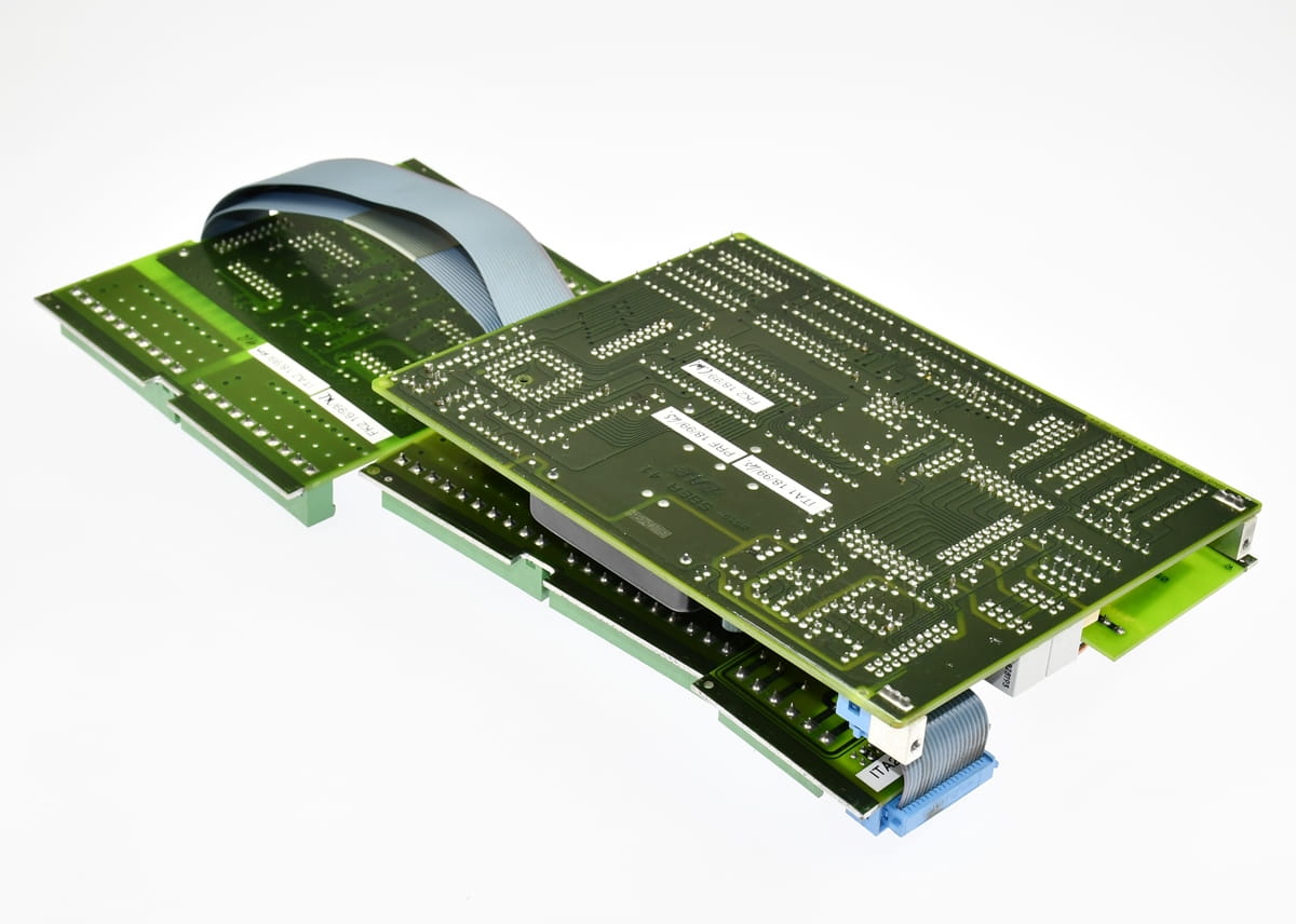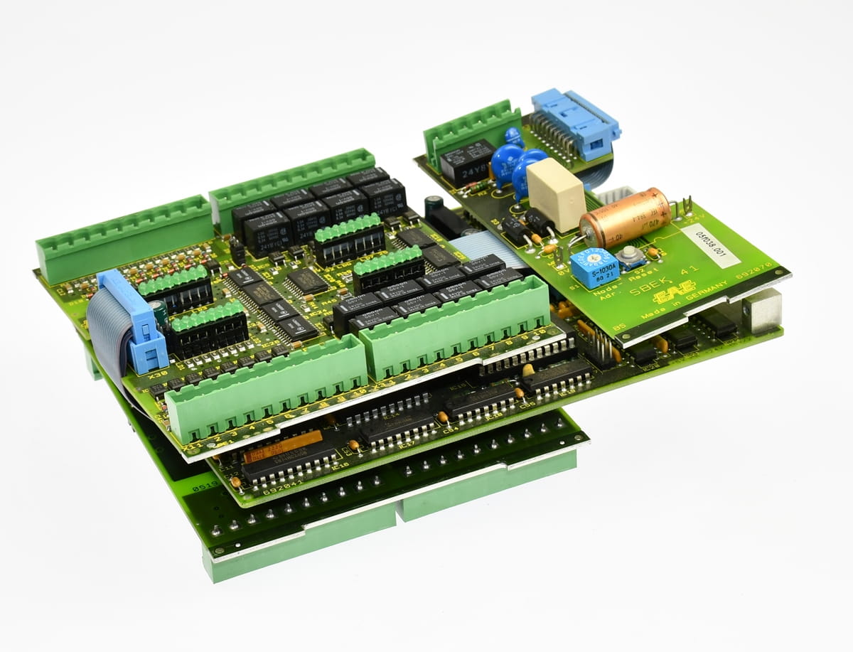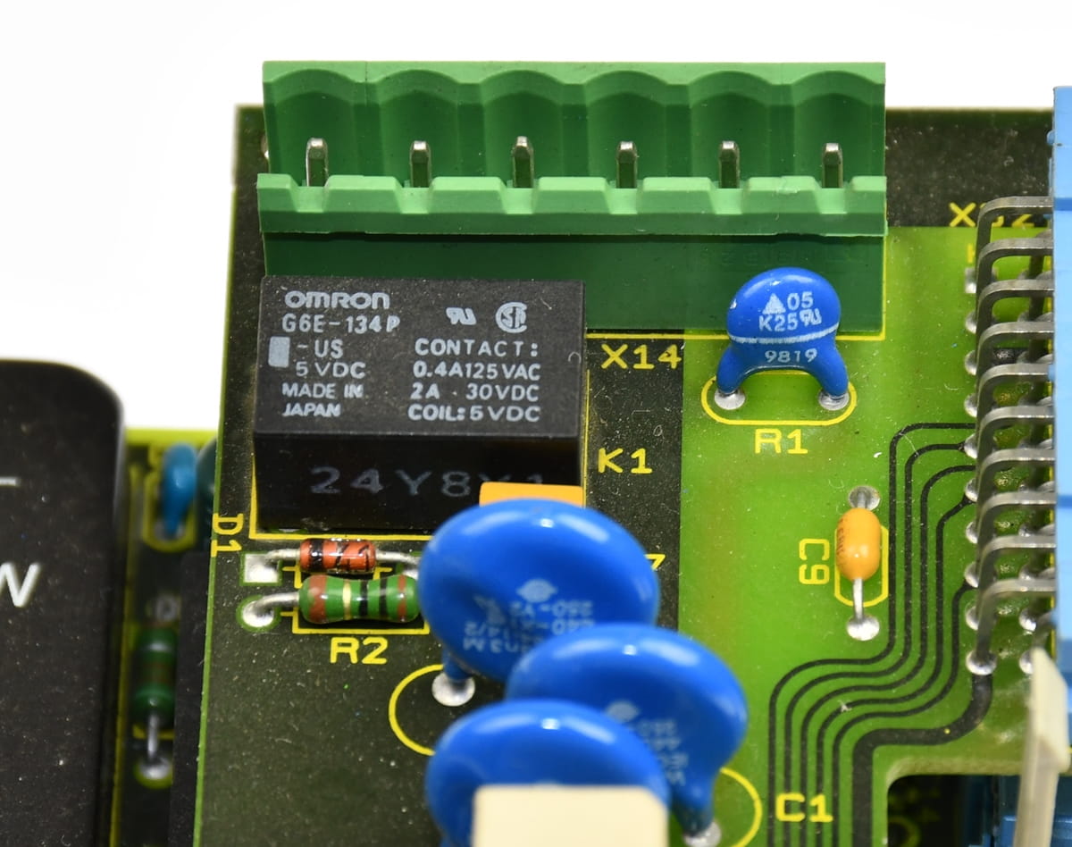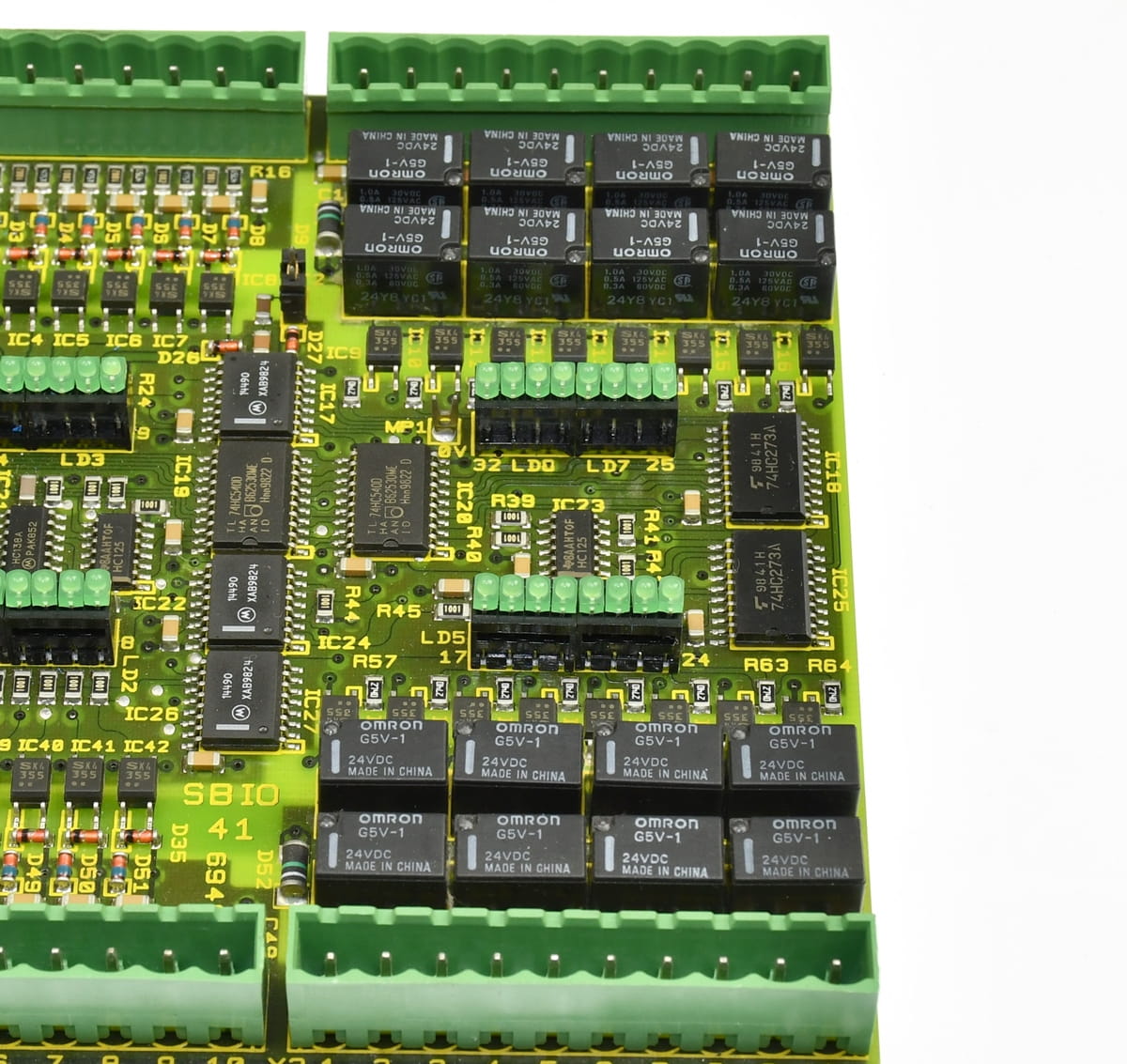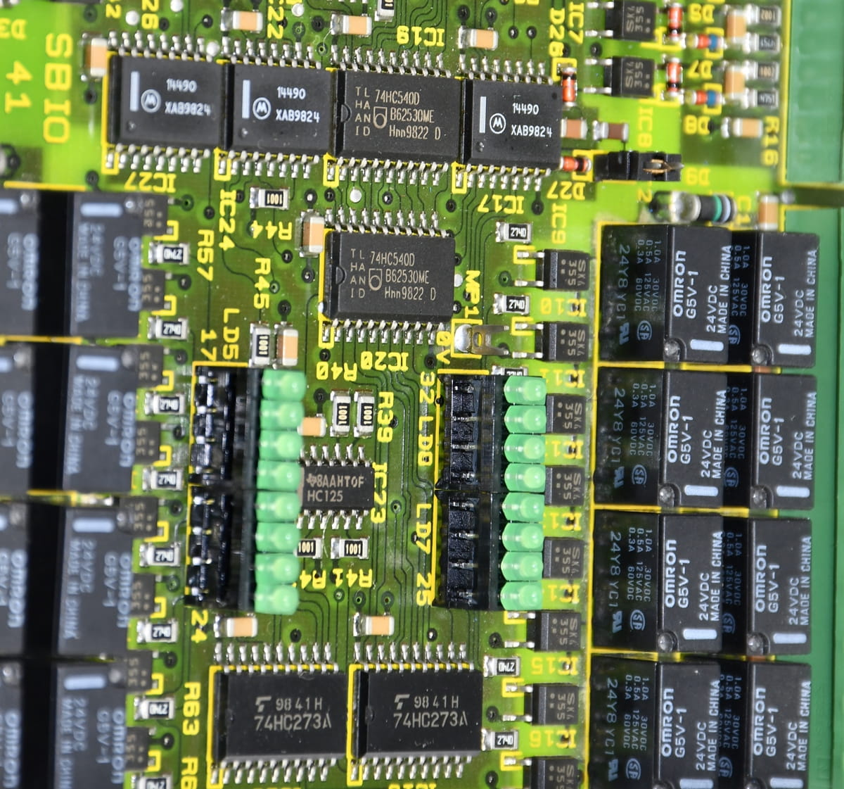 Używany moduł elektroniczny ze sterownika PLC - widoczne na zdjęciach cztery płytki PCB, na ich pokładzie między uinnymi: ukłądy scalone: XAA9824; Przekaźniki o oznaczeniu: G5V-1 firmy OMRON w ilości 16 sztuk; ECW24-0515-EP Fabrimex - Przetwornica DC/DC, moduły z diodami sygnalizacyjnymi LED, konektory i wiele innych ....