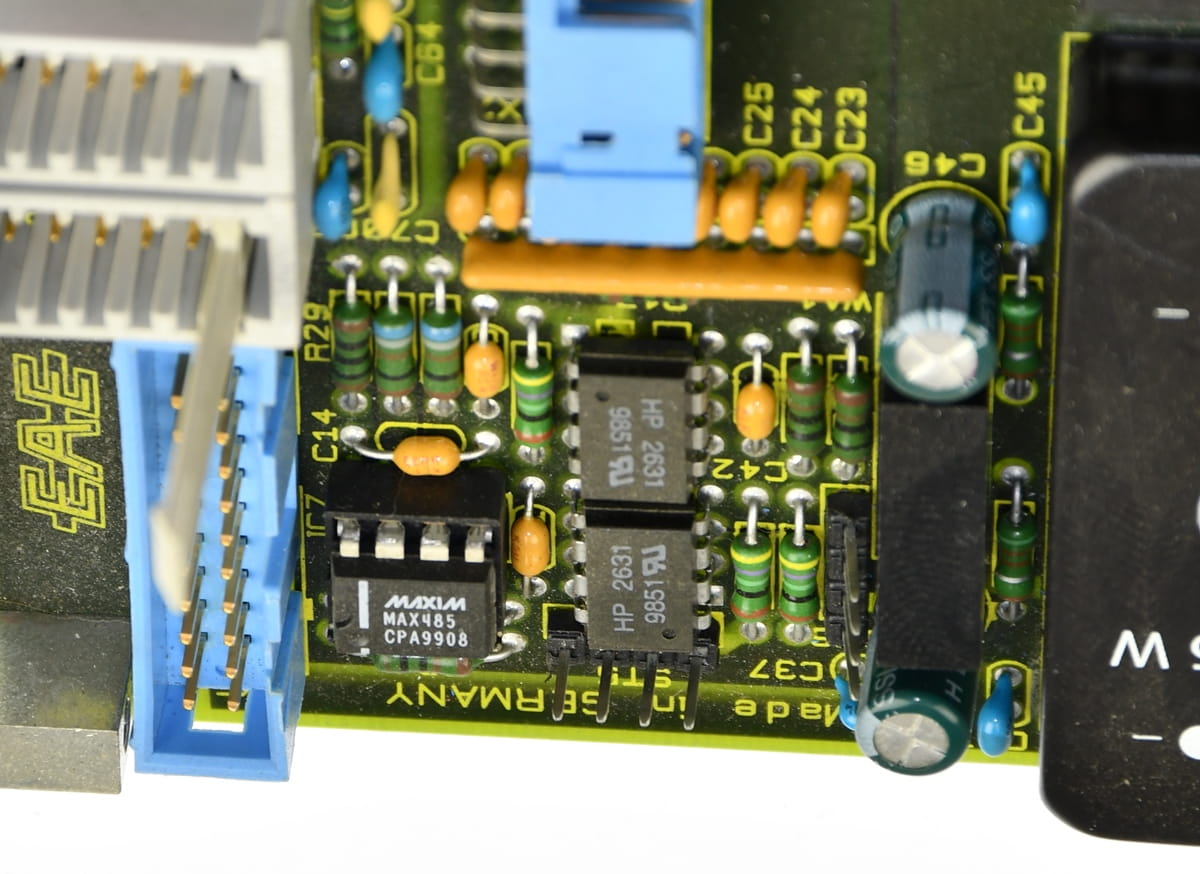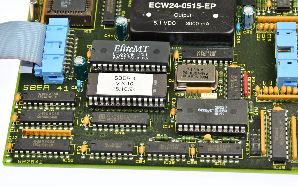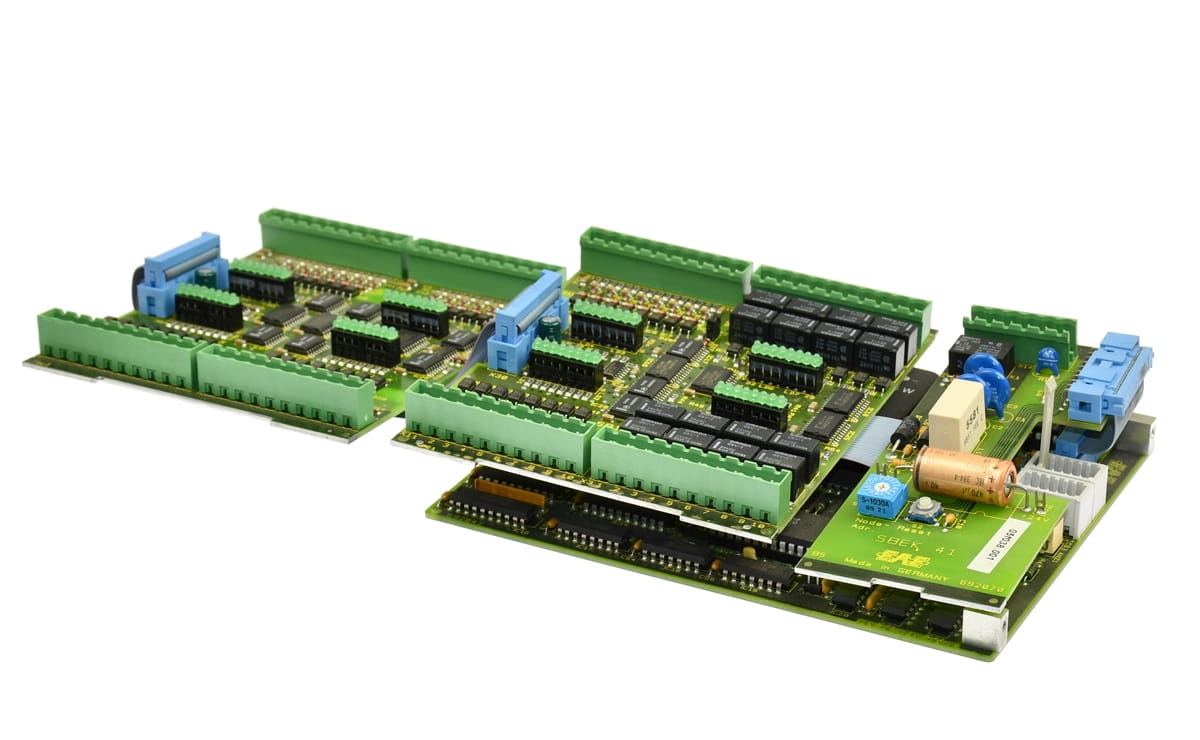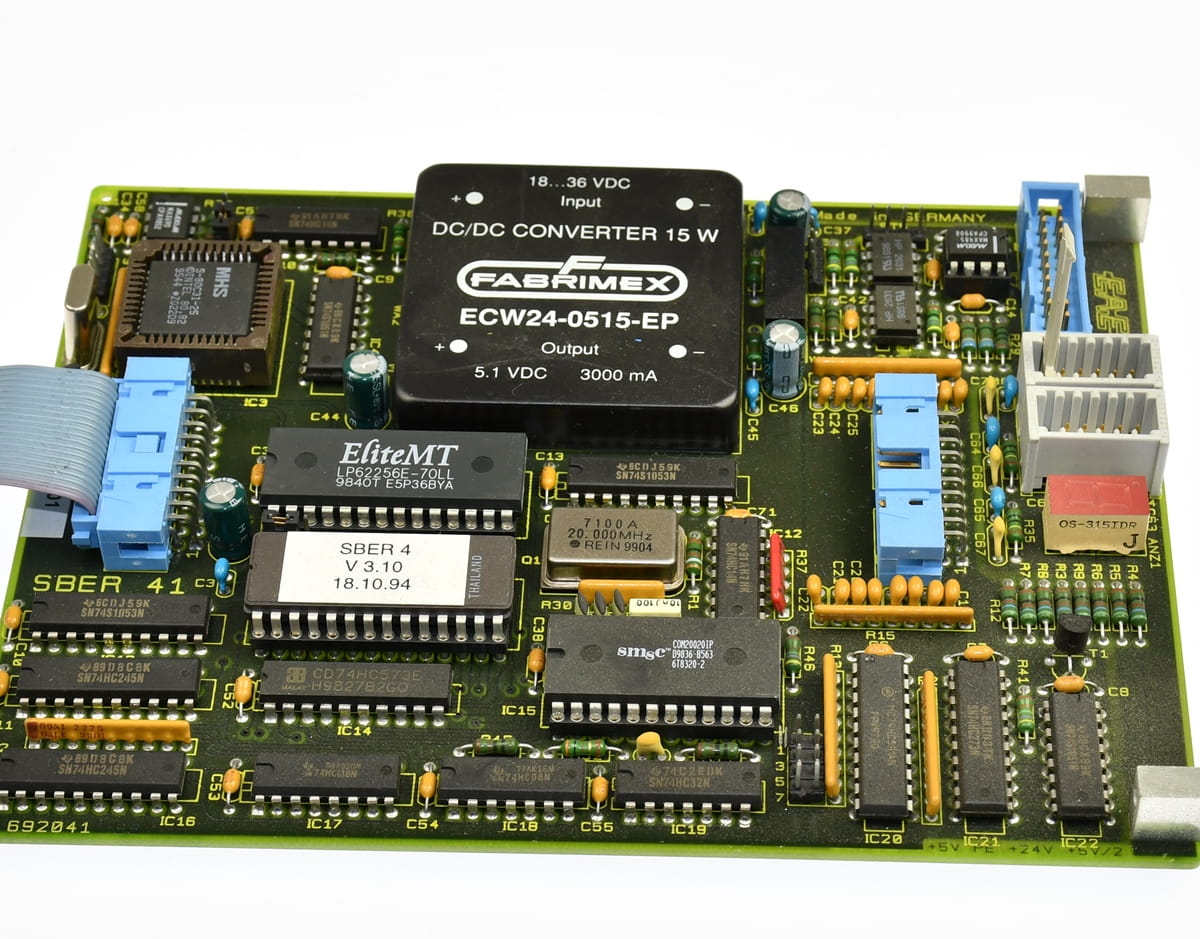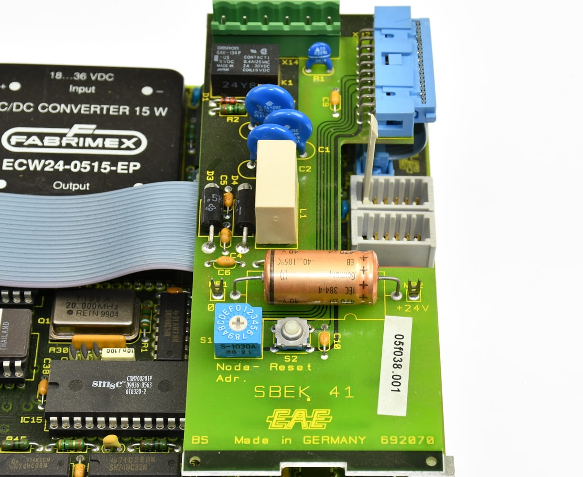 Używany moduł elektroniczny ze sterownika PLC - widoczne na zdjęciach cztery płytki PCB, na ich pokładzie między uinnymi: ukłądy scalone: XAA9824; Przekaźniki o oznaczeniu: G5V-1 firmy OMRON w ilości 16 sztuk; ECW24-0515-EP Fabrimex - Przetwornica DC/DC, moduły z diodami sygnalizacyjnymi LED, konektory i wiele innych ....
