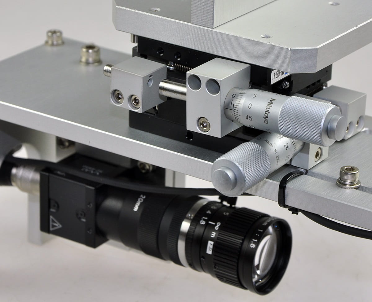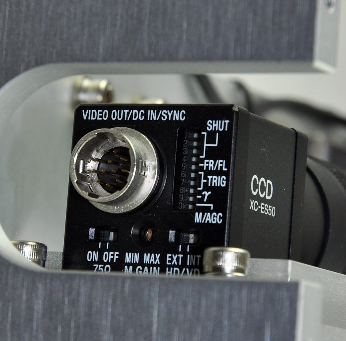 Używany, całkowicie sprawny zestaw kamery inspekcyjnej, która pracowała na szybkiej linii przemysłowej. Kamera renomowanej firmy SONY, jej symbol: XC-ES50. Kamerę sprzedajemy w komplecie z obiektywem oraz oświetlaczem LED. Są też wtyczki z odcinkami przewodów. W zestawie są też wszystkie, widoczne na zdjęciach elementy mechaniczne oraz dwa regulacyjne stoliki mikrometryczne. Kamera ma rozdzielczość 768 (H) x 494 (V); inne jej parametry:
