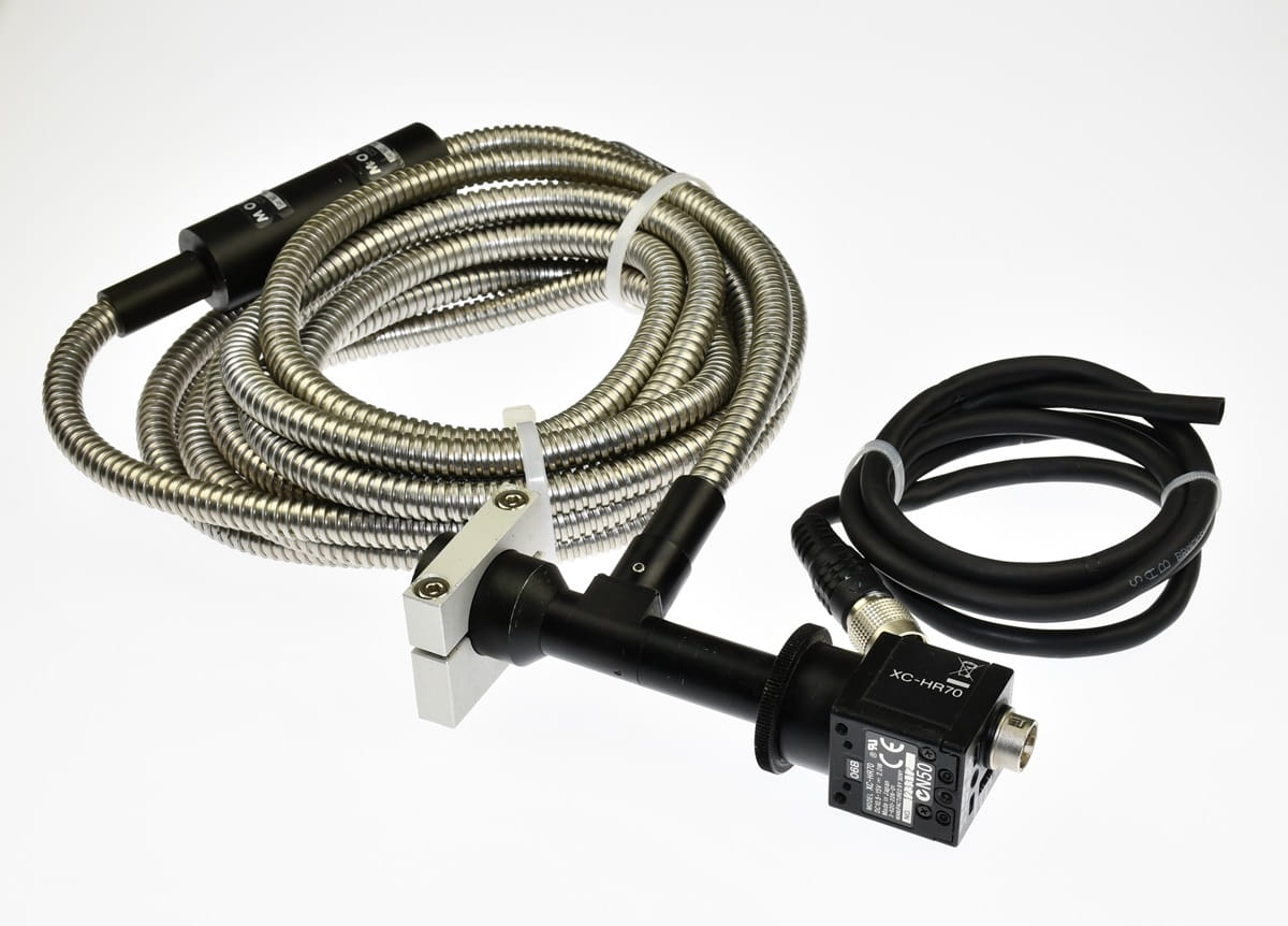 Używany, całkowicie sprawny zestaw kamery inspekcyjnej, która pracowała na szybkiej linii przemysłowej. Kamera renomowanej firmy SONY, jej symbol: XC-HR70. Kamerę sprzedajemy w komplecie z obiektywem oraz przewodami światłowodowymi firmy Moritex. Są też wtyczki z odcinkami przewodów. XC-HR70 to ultra-kompaktowy monochromatyczny moduł kamery, idealny do aplikacji do robienia zdjęć w wysokiej rozdzielczości. Przetwornik CCD 1/3 typu skanowania progresywnego wbudowany w XC-HR70 umożliwia wyświetlanie obrazów w rozdzielczości XGA (1024 × 768) z szybkością 30 klatek / s. Ponadto XC-HR70 posiada funkcję „skanowania z dużą szybkością”, która umożliwia wyjście do 120 klatek / s.
