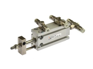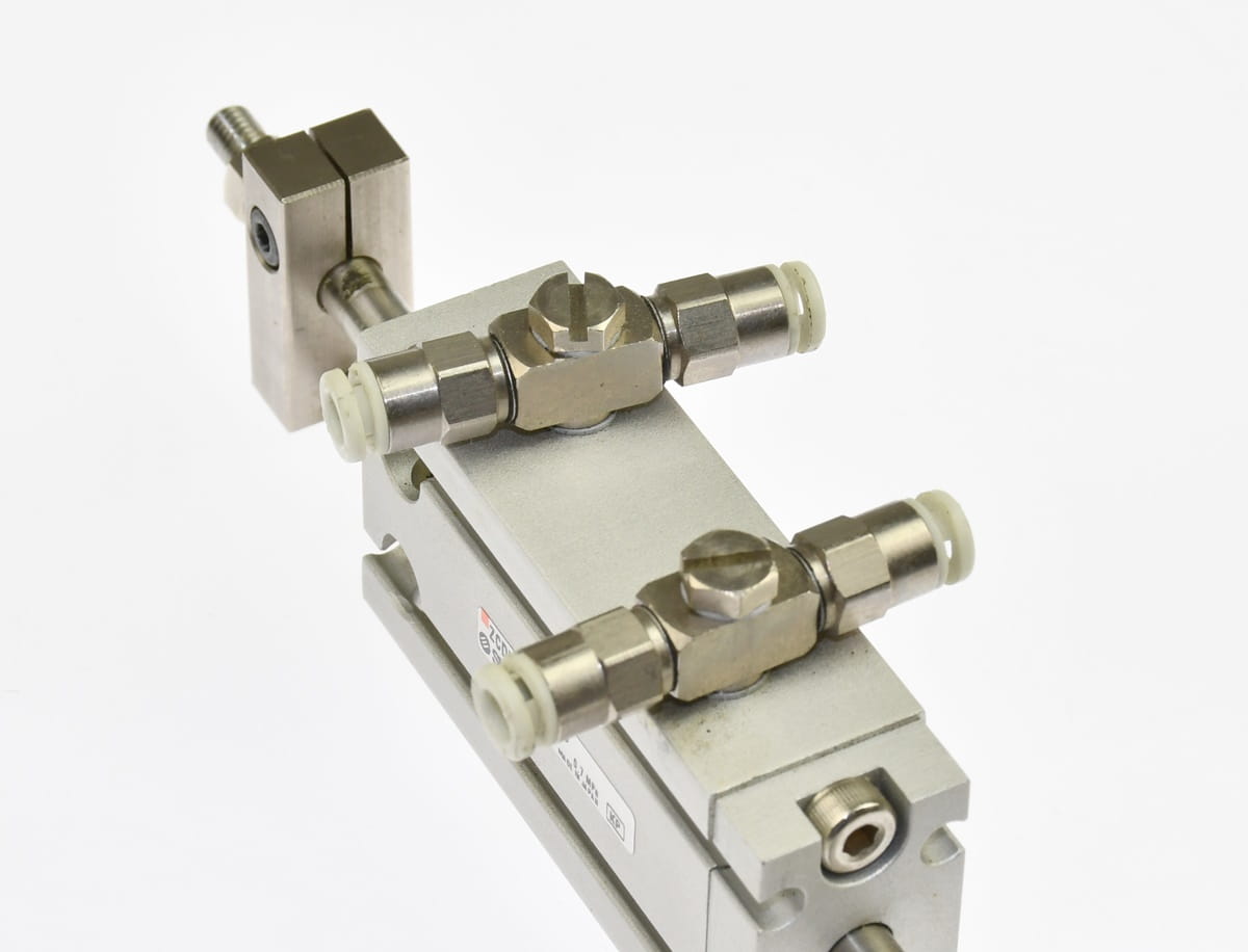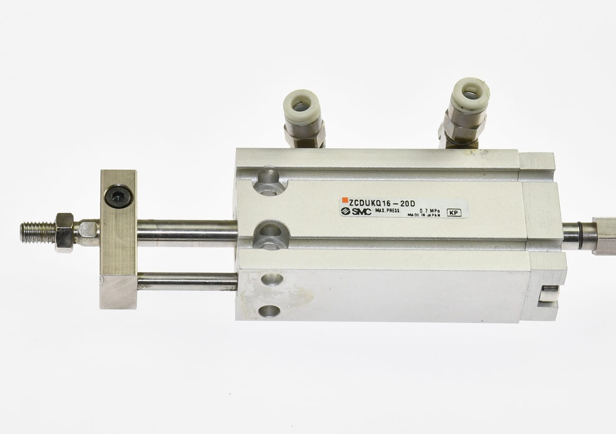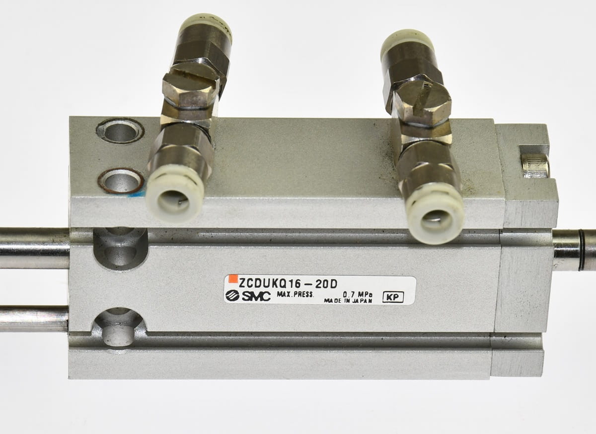 Używany siłownik pneumatyczny działania obustronnego renomowanej firmy SMC o symbolu: ZCDUKQ16-20D. Pochodzi z demontażu sprawnych maszyn przemysłowych. W zestawie sprzedajemy dwie szybkozłączki do podłączenia przewodów pneumatycznych. Siłownik posiada kanał gazowy przez środek wałka ruchomego, który często wykorzystywany jest do zasilania zamontowanych na siłowniku przyssawek, w tym kanale także jest zamontowana szybkozłączka zasilająca.