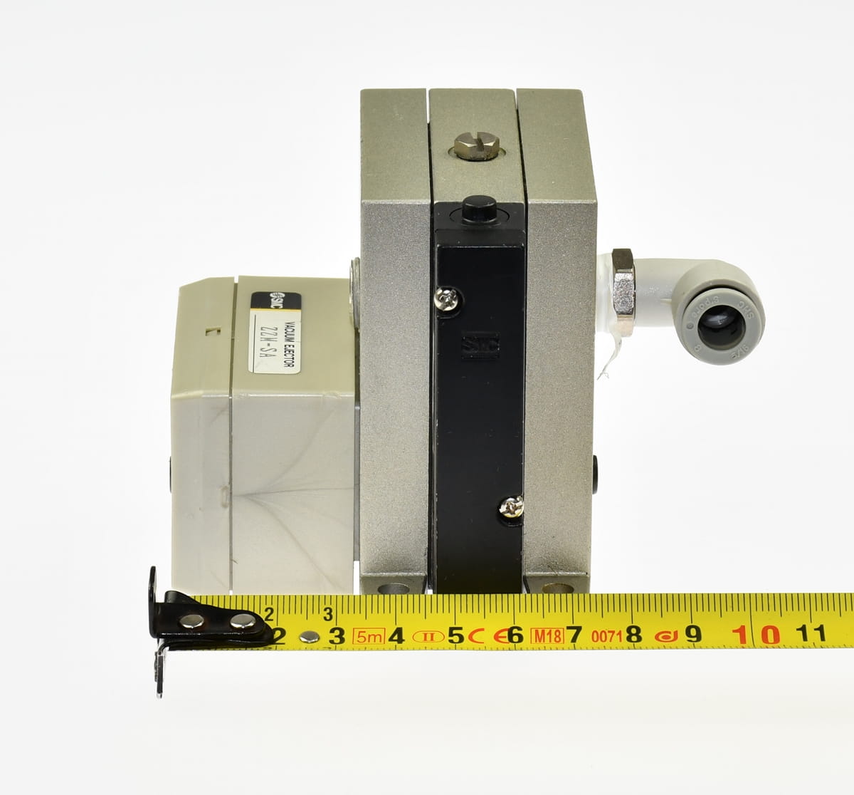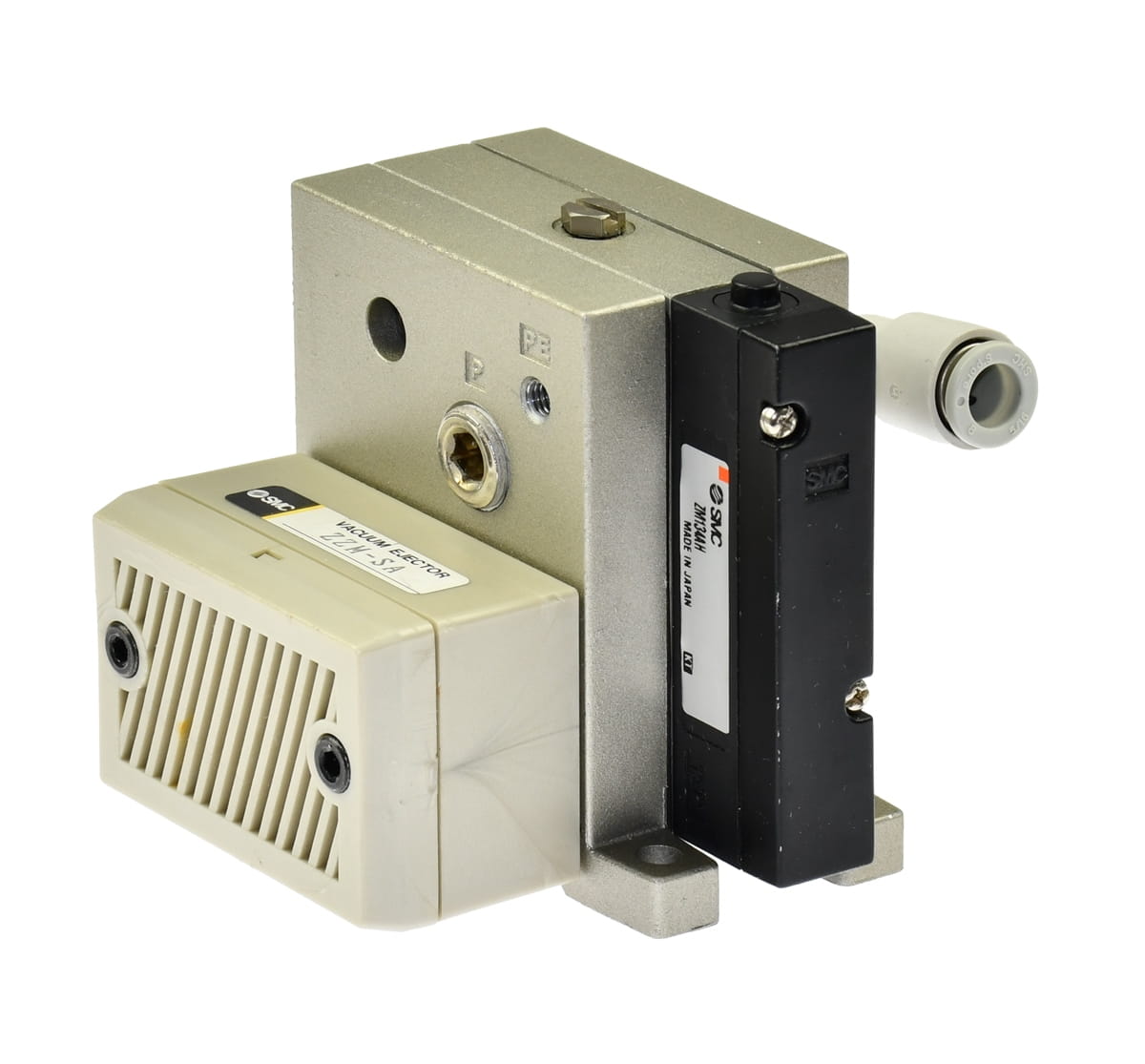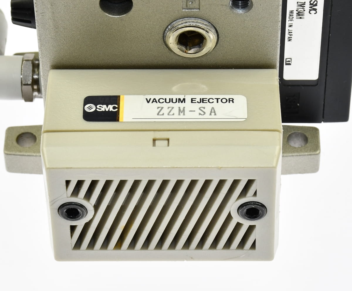 Używany, całkowicie sprawny eżektor, generator podciśnienia o symbolu: ZM134AH, produkt renomowanej firmy SMC. Stosowany do zasilania przyssawek unoszących elementy na linii produkcyjnej. W zestawie są szybkozłączki, korpus z tłumikiem hałasu ZZM-SA..