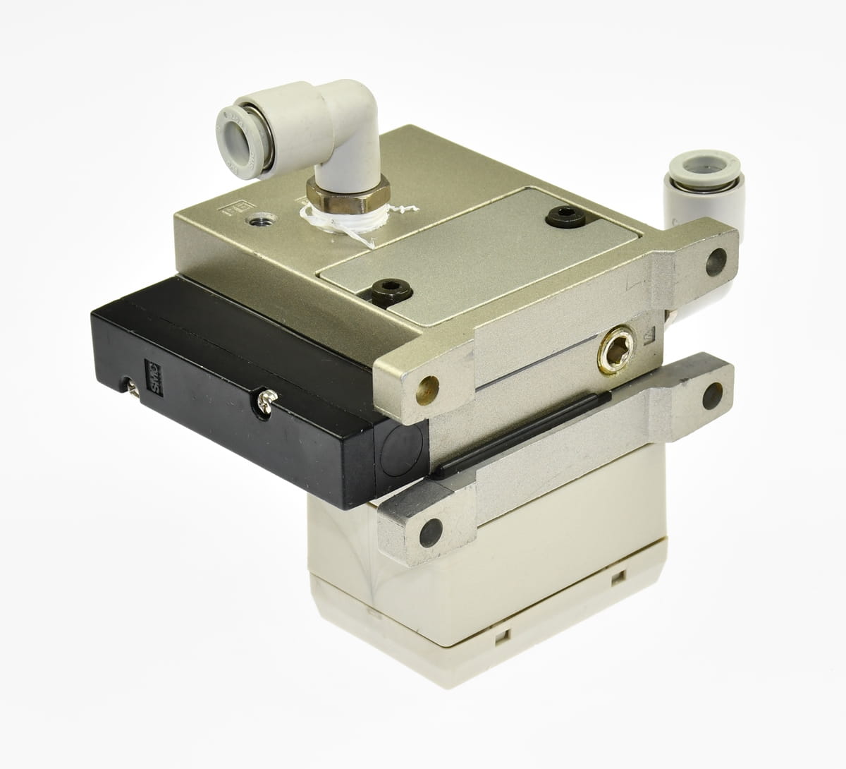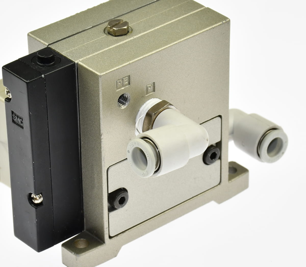 Używany, całkowicie sprawny eżektor, generator podciśnienia o symbolu: ZM134AH, produkt renomowanej firmy SMC. Stosowany do zasilania przyssawek unoszących elementy na linii produkcyjnej. W zestawie są szybkozłączki, korpus z tłumikiem hałasu ZZM-SA.