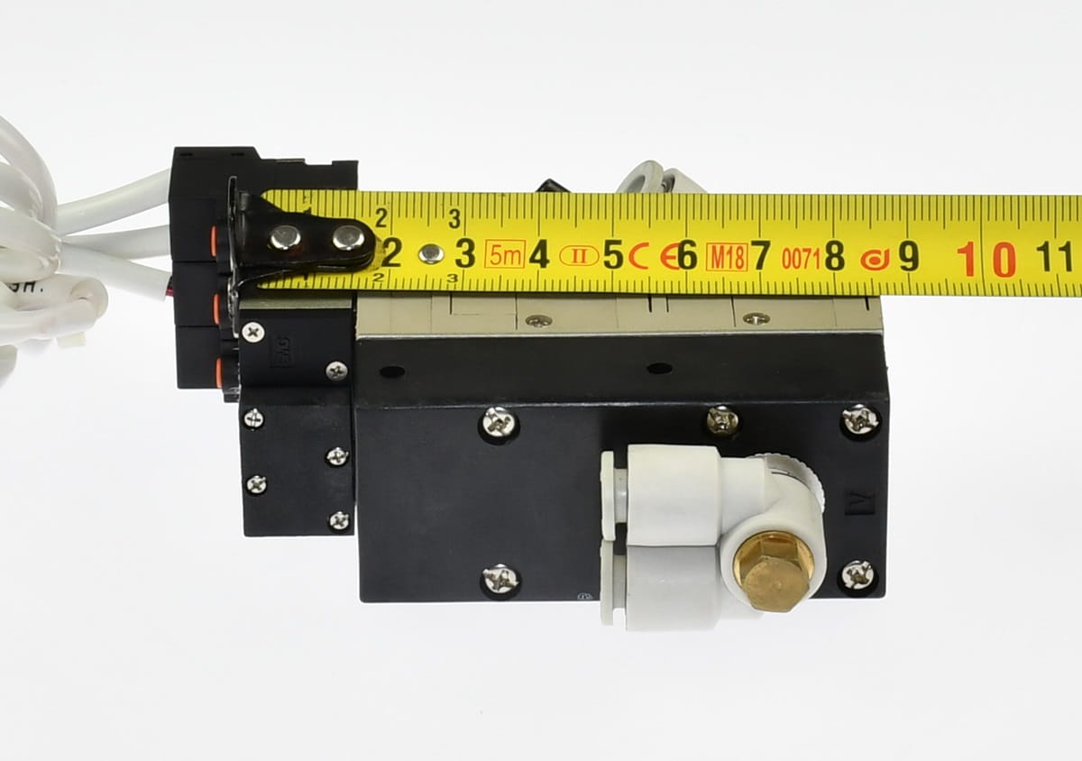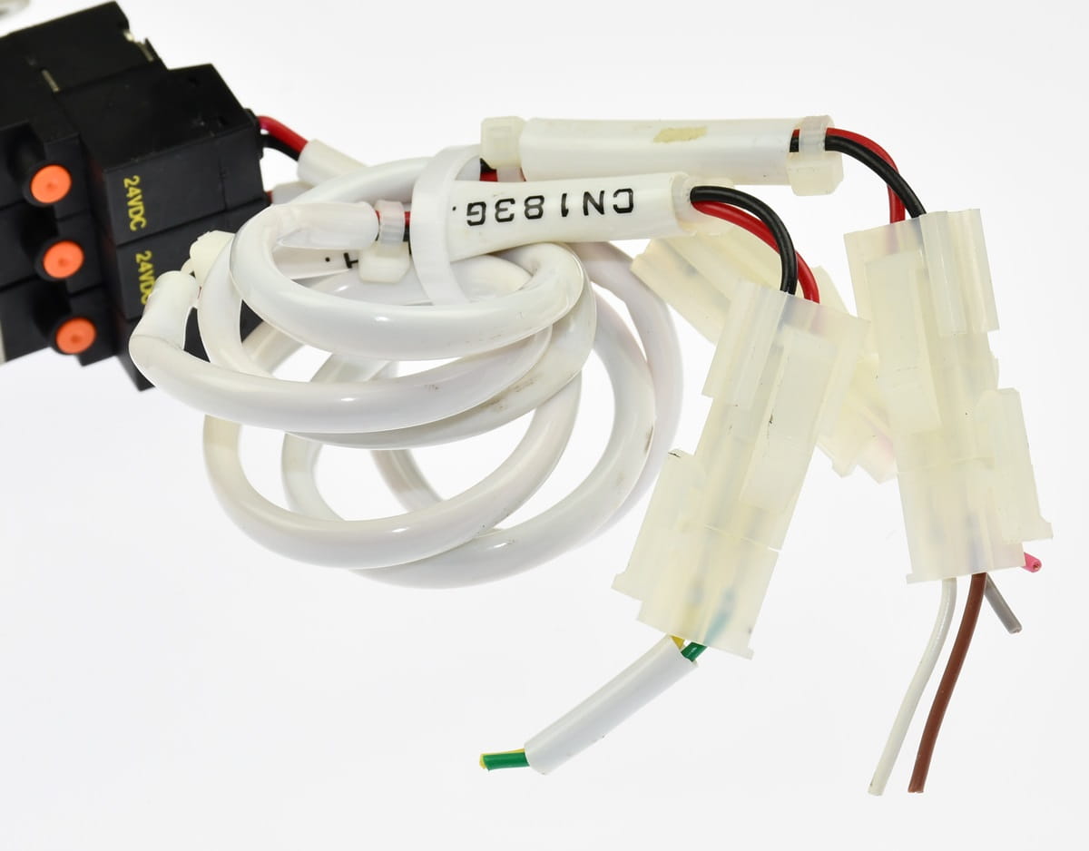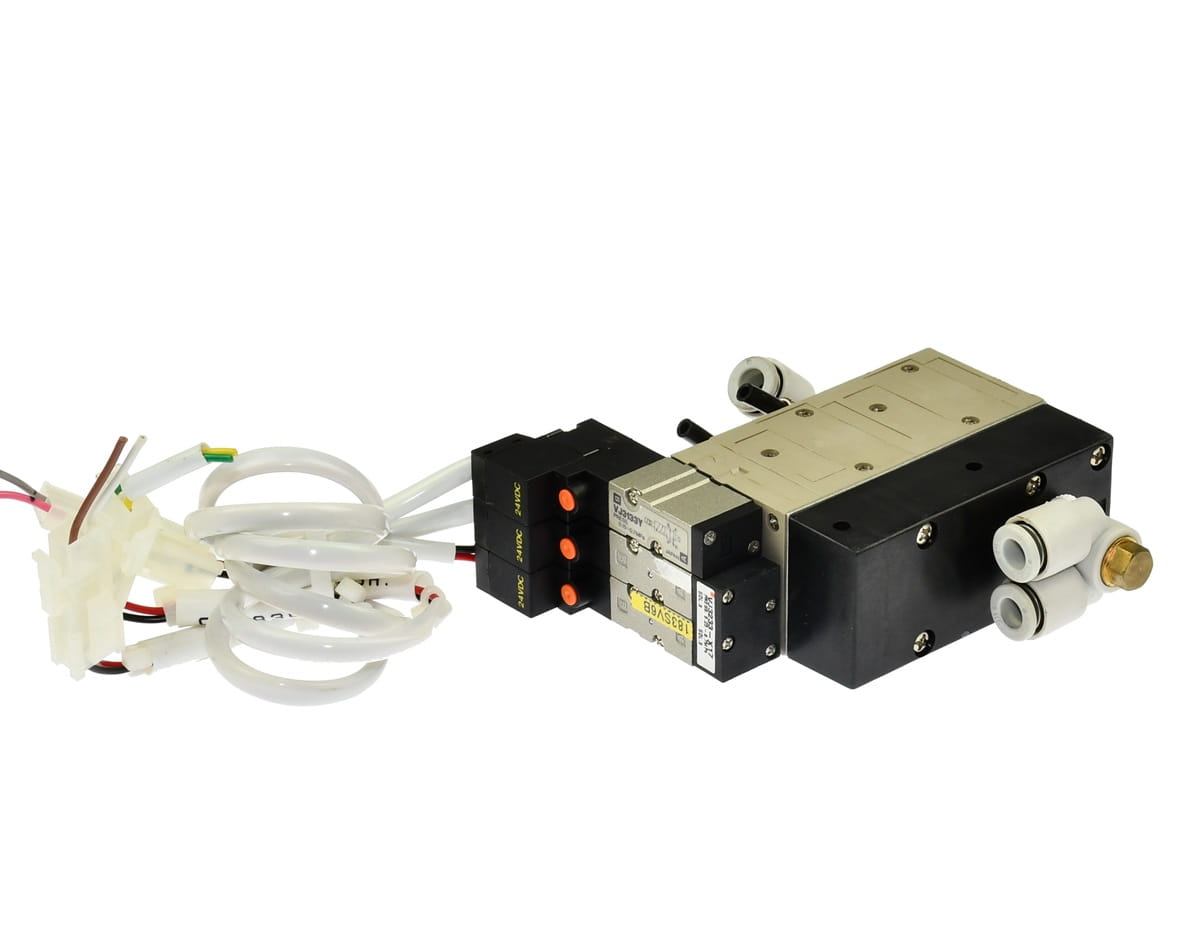 Używany generator próżni - eżektor do zasilania chwytaków podciśnieniowych - przyssawek. Produkt renomowanej firmy SMC. Symbol: ZR1-VK1Y5GS-Q. Posiada trzy elektrozawory do: Uruchamiania zasilania sprężonym powietrzem, uruchamiania wyjścia próżni i zwalniania próżni z wyjścia, co jest bardzo przydatne przy automatycznej pracy z przyssawkami. W zestawie szybkozłączki i przewody z wtyczkami do cewek.