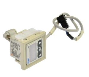 Używany, całkowicie sprawny moduł o symbolu: ZSE40-01-22, jest to precyzyjny przetwornik podciśnienia w zakresie 10 do -101,3 kPa, posiada proporcjonalne wyjście analogowe oraz dwa programowalne wyjścia binarne, które można wykorzystać do sterowania pompą próżniową, zaworem upustowym lub wedle innych potrzeb. Producentem jest renomowana firma SMC, w zestawie jest szybkozłączka do podłączenia przewodu próżni. Jest też ramka i uchwyt do montażu panelowego, brakuje w niej jednego zatrzasku, tego białego, który widać na pierwszym zdjęciu.