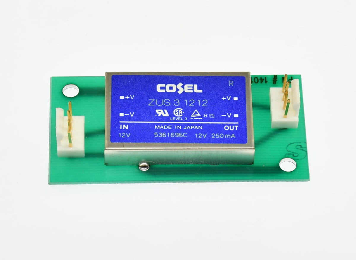 Używana, całkowicie sprawna przetwornica o symbolu: ZUS 3 1212, producent COSEL. Przetwornica izolująca napięcie DC/DC 12V na 12V z wydajnością prądu a wyjściu 250mA. Wlutowana w płytkę PCB ze złączami. Pochodzi z demontażu całkowicie sprawnych maszyn przemysłowych.