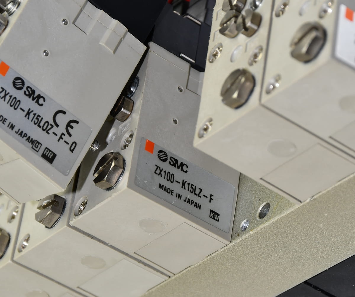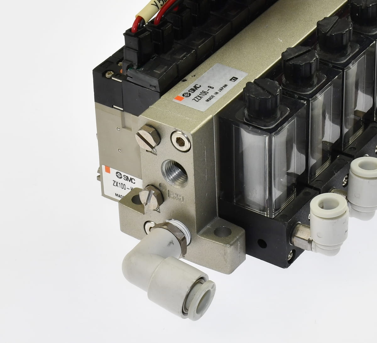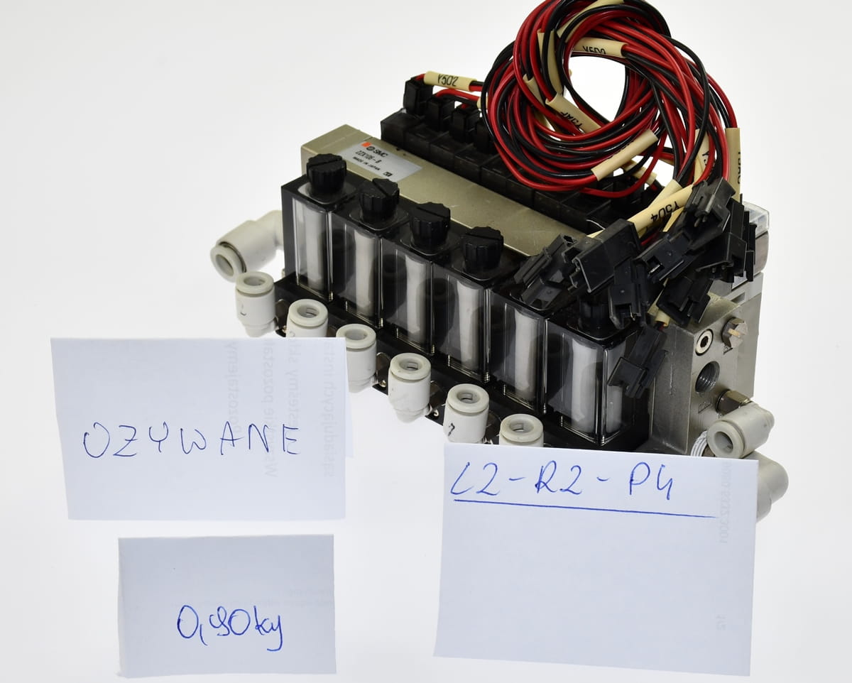 Używany zestaw elektrozaworów o oznaczeniu: ZX100-K15LZ-F oraz ZX100-K15LZ-F-Q z blokiem zbiorczym: ZZX106-B. Produkt firmy SMC. Do każdego zaworu jest też zamontowany filtr. W zestawie są także przewody z wtyczkami do cewek oraz widoczne na zdjęciach szybkozłączki. Cewki sterowane napięciem stałym 24V. W każdym zaworze piloty o oznaczeniu: V114-5LOZ również od SMC. Zestaw pochodzi z demontażu całkowicie sprawnych maszyn przemysłowych.