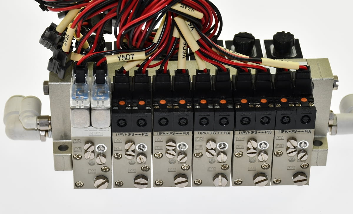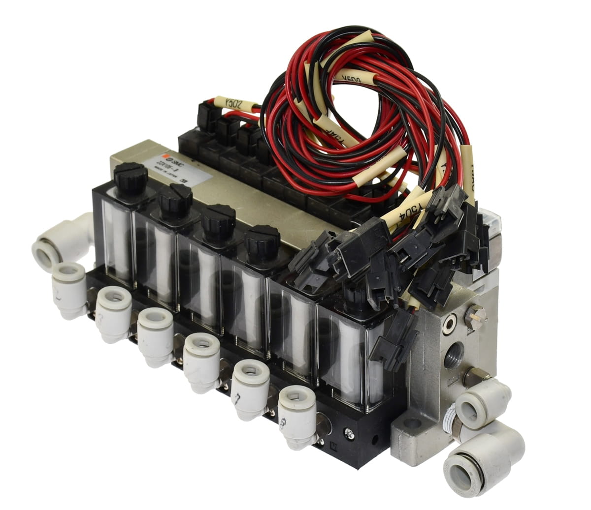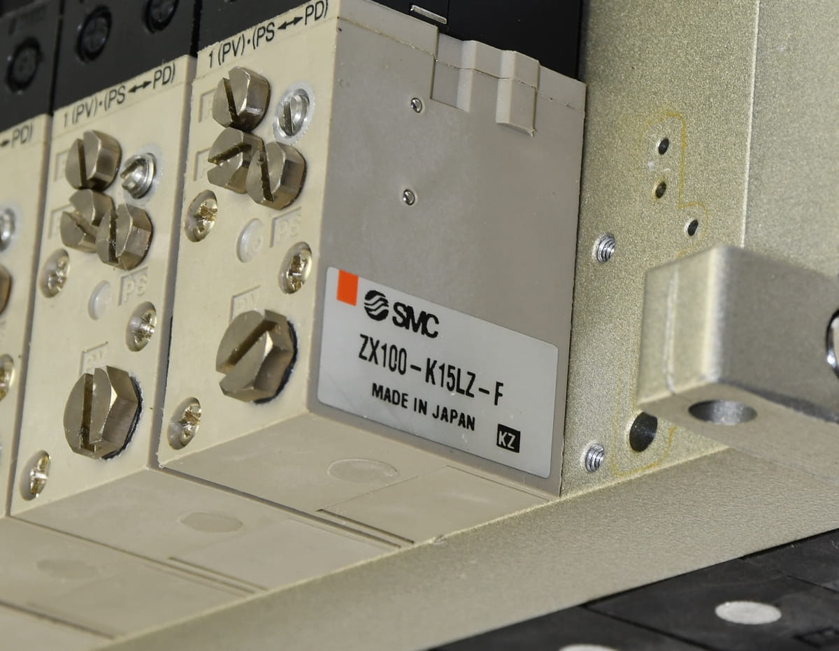 Używany zestaw elektrozaworów o oznaczeniu: ZX100-K15LZ-F oraz ZX100-K15LZ-F-Q z blokiem zbiorczym: ZZX106-B. Produkt firmy SMC. Do każdego zaworu jest też zamontowany filtr. W zestawie są także przewody z wtyczkami do cewek oraz widoczne na zdjęciach szybkozłączki. Cewki sterowane napięciem stałym 24V. W każdym zaworze piloty o oznaczeniu: V114-5LOZ również od SMC. Zestaw pochodzi z demontażu całkowicie sprawnych maszyn przemysłowych.
