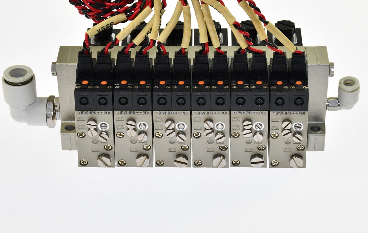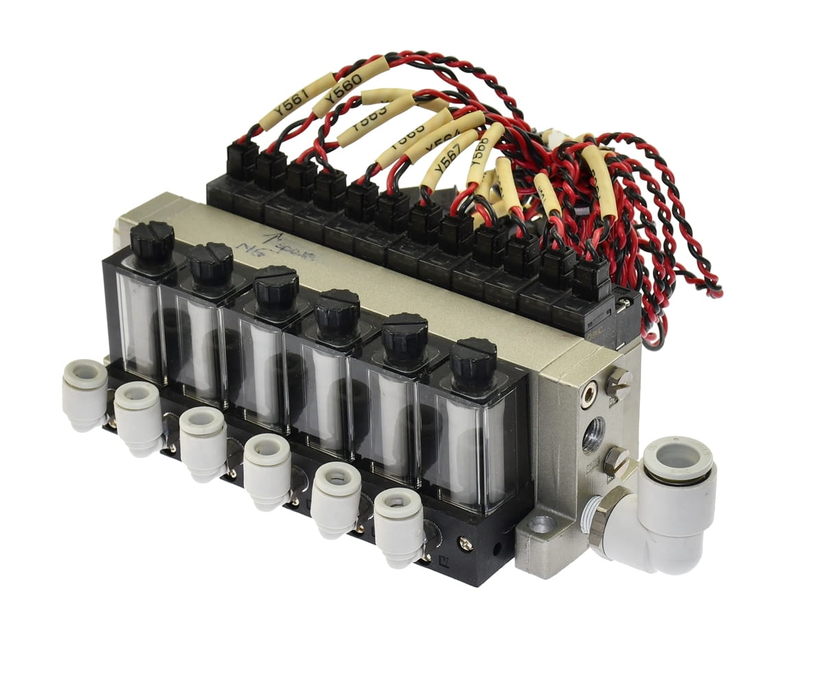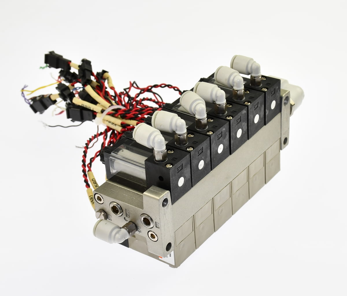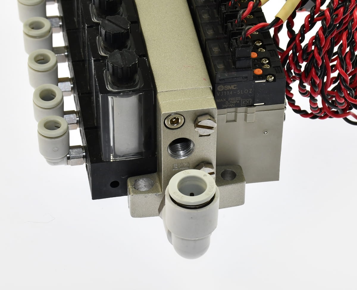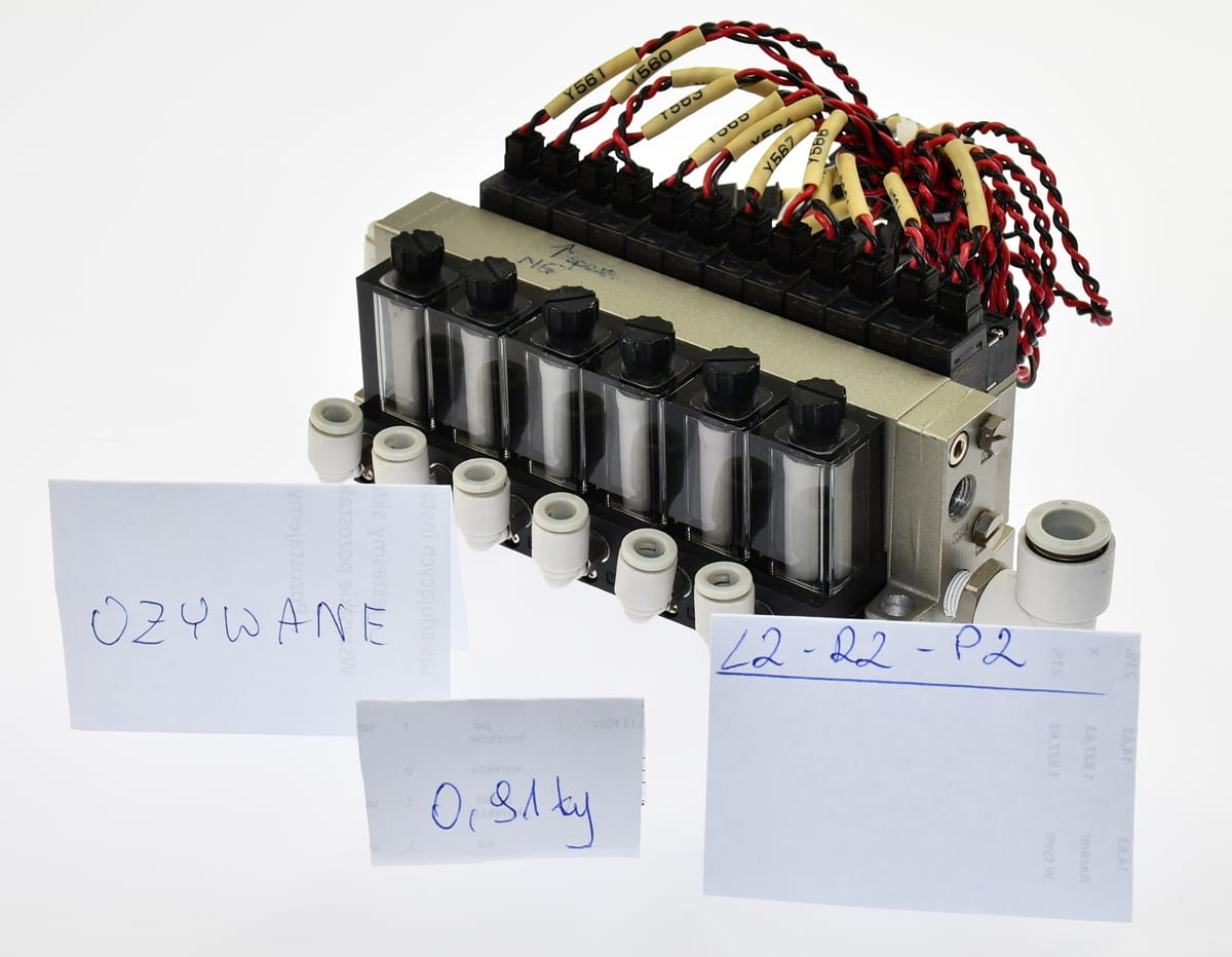 Używany zestaw sześciu elektrozaworów o oznaczeniu: ZX100-K15LZ-F z blokiem zbiorczym: ZZX106-B. Produkt firmy SMC. Do każdego zaworu jest też zamontowany filtr. W zestawie są także przewody z wtyczkami do cewek oraz widoczne na zdjęciach szybkozłączki. Cewki sterowane napięciem stałym 24V. W każdym zaworze piloty o oznaczeniu: V114-5LOZ również od SMC. Jedna z sekcji opisana na obudowie jako niesprawna. Zestaw pochodzi z demontażu całkowicie sprawnych maszyn przemysłowych.